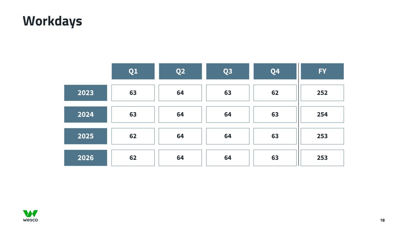 Workdays Q1 Q2 Q3 Q4 FY 2024 63 64 64 63 254 2025 62 64 64 63 253 2026 62 64 64 63 253 2023 63 64 63 62 252 18