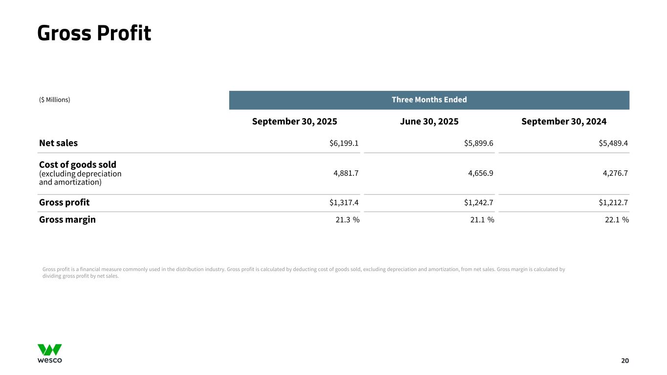 Gross Profit 20 ($ Millions) Three Months Ended September 30, 2025 June 30, 2025 September 30, 2024 Net sales $6,199.1 $5,899.6 $5,489.4 Cost of goods sold (excluding depreciation and amortization) 4,881.7 4,656.9 4,276.7 Gross profit $1,317.4 $1,242.7 $1,212.7 Gross margin 21.3 % 21.1 % 22.1 % Gross profit is a financial measure commonly used in the distribution industry. Gross profit is calculated by deducting cost of goods sold, excluding depreciation and amortization, from net sales. Gross margin is calculated by dividing gross profit by net sales.