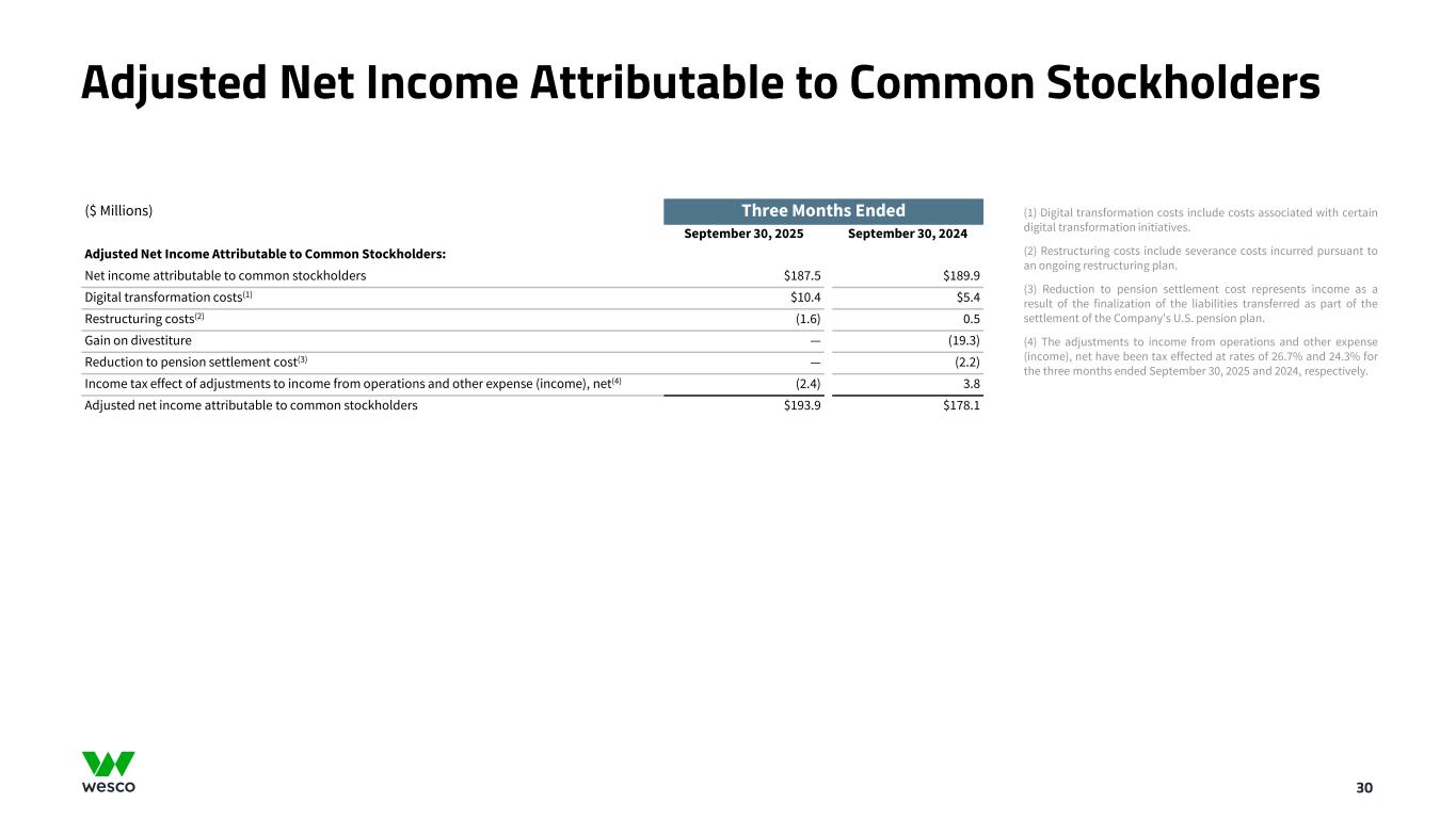 Adjusted SG&A, Income from Operations, Other Expense (Income), and Provision for Income Taxes 29 ($ Millions) Three Months Ended September 30, 2025 September 30, 2024 Adjusted SG&A Expenses: Selling, general and administrative expenses $922.9 $831.1 Digital transformation costs(1) (10.4) (5.4) Restructuring costs(2) 1.6 (0.5) Adjusted selling, general and administrative expenses $914.1 $825.2 Percentage of net sales 14.7 % 15.0 % Adjusted Income from Operations: Income from operations $345.4 $335.6 Digital transformation costs(1) 10.4 5.4 Restructuring costs(2) (1.6) 0.5 Adjusted income from operations $354.2 $341.5 Adjusted income from operations margin % 5.7 % 6.2 % Adjusted Other Expense (Income), net: Other expense (income), net $— $(24.9) Gain on divestiture — 19.3 Reduction to pension settlement cost(3) — 2.2 Adjusted other expense (income), net $— $(3.4) Adjusted Provision for Income Taxes: Provision for income taxes $57.8 $69.3 Income tax effect of adjustments to income from operations and other expense (income), net(4) 2.4 (3.8) Adjusted provision for income taxes $60.2 $65.5 (1) Digital transformation costs include costs associated with certain digital transformation initiatives. (2) Restructuring costs include severance costs incurred pursuant to an ongoing restructuring plan. (3) Reduction to pension settlement cost represents income as a result of the finalization of the liabilities transferred as part of the settlement of the Company's U.S. pension plan. (4) The adjustments to income from operations and other expense (income), net have been tax effected at rates of 26.7% and 24.3% for the three months ended September 30, 2025 and 2024, respectively.