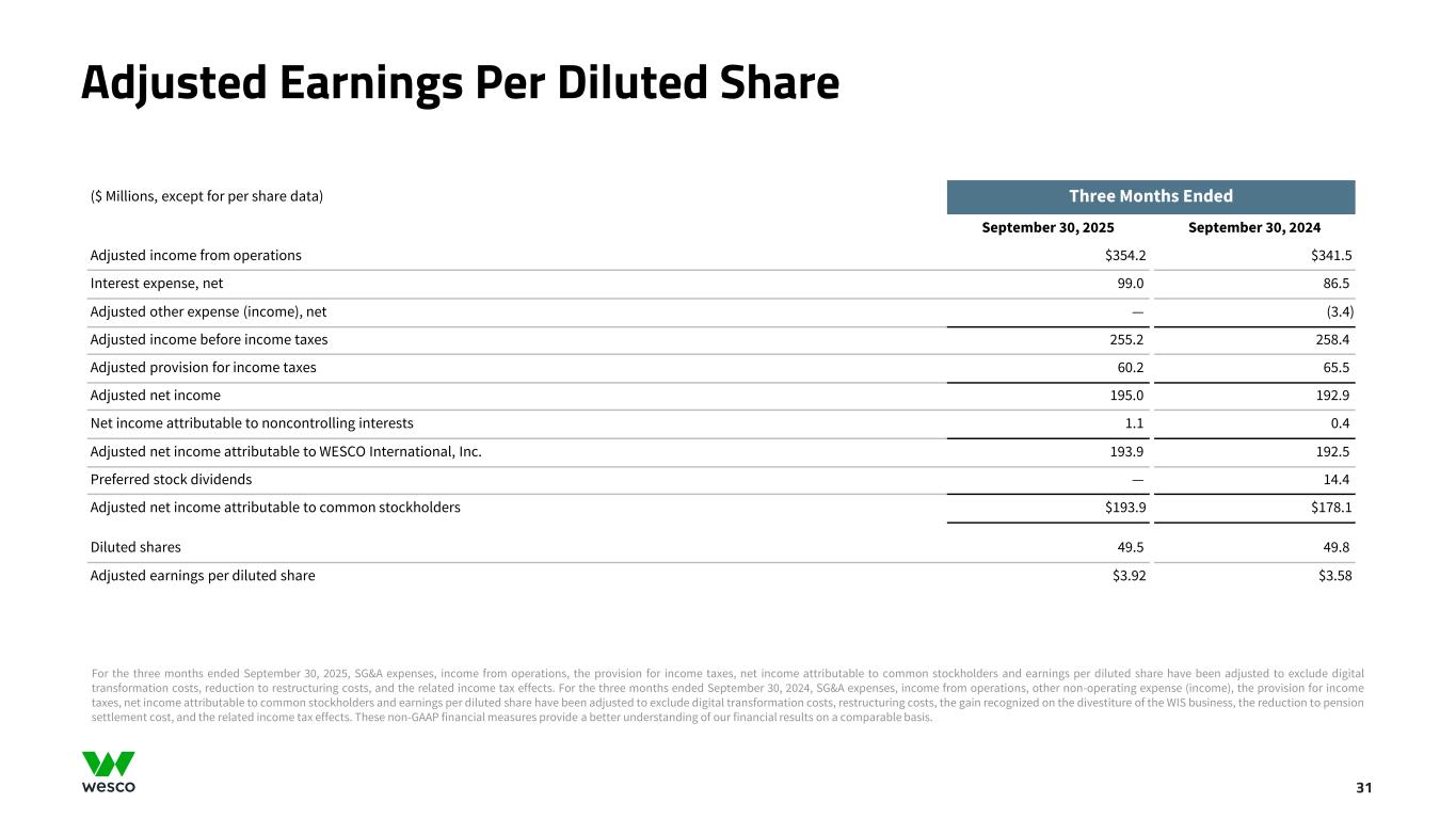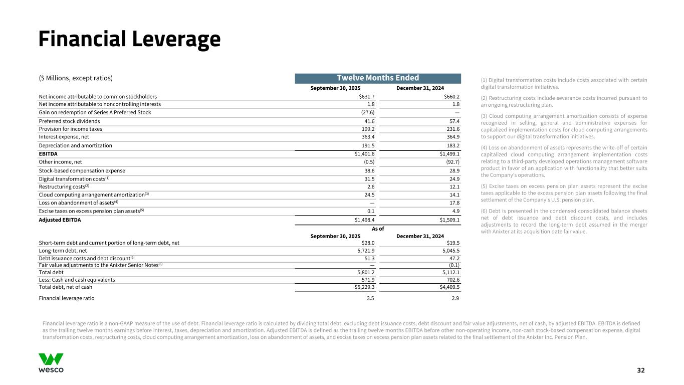 Adjusted Earnings Per Diluted Share 31 ($ Millions, except for per share data) Three Months Ended September 30, 2025 September 30, 2024 Adjusted income from operations $354.2 $341.5 Interest expense, net 99.0 86.5 Adjusted other expense (income), net — (3.4) Adjusted income before income taxes 255.2 258.4 Adjusted provision for income taxes 60.2 65.5 Adjusted net income 195.0 192.9 Net income attributable to noncontrolling interests 1.1 0.4 Adjusted net income attributable to WESCO International, Inc. 193.9 192.5 Preferred stock dividends — 14.4 Adjusted net income attributable to common stockholders $193.9 $178.1 Diluted shares 49.5 49.8 Adjusted earnings per diluted share $3.92 $3.58 For the three months ended September 30, 2025, SG&A expenses, income from operations, the provision for income taxes, net income attributable to common stockholders and earnings per diluted share have been adjusted to exclude digital transformation costs, reduction to restructuring costs, and the related income tax effects. For the three months ended September 30, 2024, SG&A expenses, income from operations, other non-operating expense (income), the provision for income taxes, net income attributable to common stockholders and earnings per diluted share have been adjusted to exclude digital transformation costs, restructuring costs, the gain recognized on the divestiture of the WIS business, the reduction to pension settlement cost, and the related income tax effects. These non-GAAP financial measures provide a better understanding of our financial results on a comparable basis.