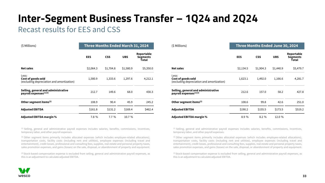 Inter-Segment Business Transfer – 1Q24 and 2Q24 33 (1) Selling, general and administrative payroll expenses includes salaries, benefits, commissions, incentives, temporary labor, and other payroll expenses. (2) Other segment items primarily includes allocated expenses (which includes employee-related allocations), transportation costs, facility costs (including rent and utilities), employee expenses (including travel and entertainment), credit losses, professional and consulting fees, supplies, real estate and personal property taxes, sales promotion expenses, and gains (losses) on the sale, disposal, or abandonment of property and equipment. (3) Stock-based compensation expense is excluded from selling, general and administrative payroll expenses, as this is an adjustment to calculate adjusted EBITDA. (1) Selling, general and administrative payroll expenses includes salaries, benefits, commissions, incentives, temporary labor, and other payroll expenses. (2) Other segment items primarily includes allocated expenses (which includes employee-related allocations), transportation costs, facility costs (including rent and utilities), employee expenses (including travel and entertainment), credit losses, professional and consulting fees, supplies, real estate and personal property taxes, sales promotion expenses, and gains (losses) on the sale, disposal, or abandonment of property and equipment. (3) Stock-based compensation expense is excluded from selling, general and administrative payroll expenses, as this is an adjustment to calculate adjusted EBITDA. ($ Millions) Three Months Ended June 30, 2024 EES CSS UBS Reportable Segments Total Net sales $2,134.5 $1,904.3 $1,440.9 $5,479.7 Less: Cost of goods sold (excluding depreciation and amortization) 1,623.1 1,492.0 1,166.6 4,281.7 Selling, general and administrative payroll expenses(1)(3) 212.6 157.0 58.2 427.8 Other segment items(2) 108.6 99.8 42.6 251.0 Adjusted EBITDA $190.2 $155.5 $173.5 $519.2 Adjusted EBITDA margin % 8.9 % 8.2 % 12.0 % ($ Millions) Three Months Ended March 31, 2024 EES CSS UBS Reportable Segments Total Net sales $2,064.3 $1,704.8 $1,580.9 $5,350.0 Less: Cost of goods sold (excluding depreciation and amortization) 1,580.9 1,333.6 1,297.6 4,212.1 Selling, general and administrative payroll expenses(1)(3) 212.7 149.6 68.0 430.3 Other segment items(2) 108.9 90.4 45.9 245.2 Adjusted EBITDA $161.8 $131.2 $169.4 $462.4 Adjusted EBITDA margin % 7.8 % 7.7 % 10.7 % Recast results for EES and CSS