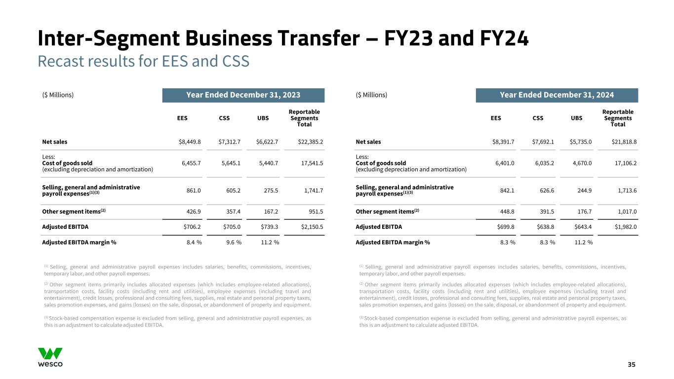 Inter-Segment Business Transfer – 3Q24 and 4Q24 34 ($ Millions) Three Months Ended September 30, 2024 EES CSS UBS Reportable Segments Total Net sales $2,110.4 $1,995.9 $1,383.1 $5,489.4 Less: Cost of goods sold (excluding depreciation and amortization) 1,598.6 1,556.7 1,121.4 4,276.7 Selling, general and administrative payroll expenses(1)(3) 216.8 160.4 60.9 438.1 Other segment items(2) 113.7 98.6 44.3 256.6 Adjusted EBITDA $181.3 $180.2 $156.5 $518.0 Adjusted EBITDA margin % 8.6 % 9.0 % 11.3 % ($ Millions) Three Months Ended December 31, 2024 EES CSS UBS Reportable Segments Total Net sales $2,082.5 $2,087.1 $1,330.1 $5,499.7 Less: Cost of goods sold (excluding depreciation and amortization) 1,598.5 1,652.8 1,084.4 4,335.7 Selling, general and administrative payroll expenses(1)(3) 200.0 159.6 57.8 417.4 Other segment items(2) 117.6 102.9 43.8 264.3 Adjusted EBITDA $166.4 $171.8 $144.1 $482.3 Adjusted EBITDA margin % 8.0 % 8.2 % 10.8 % Recast results for EES and CSS (1) Selling, general and administrative payroll expenses includes salaries, benefits, commissions, incentives, temporary labor, and other payroll expenses. (2) Other segment items primarily includes allocated expenses (which includes employee-related allocations), transportation costs, facility costs (including rent and utilities), employee expenses (including travel and entertainment), credit losses, professional and consulting fees, supplies, real estate and personal property taxes, sales promotion expenses, and gains (losses) on the sale, disposal, or abandonment of property and equipment. (3) Stock-based compensation expense is excluded from selling, general and administrative payroll expenses, as this is an adjustment to calculate adjusted EBITDA. (1) Selling, general and administrative payroll expenses includes salaries, benefits, commissions, incentives, temporary labor, and other payroll expenses. (2) Other segment items primarily includes allocated expenses (which includes employee-related allocations), transportation costs, facility costs (including rent and utilities), employee expenses (including travel and entertainment), credit losses, professional and consulting fees, supplies, real estate and personal property taxes, sales promotion expenses, and gains (losses) on the sale, disposal, or abandonment of property and equipment. (3) Stock-based compensation expense is excluded from selling, general and administrative payroll expenses, as this is an adjustment to calculate adjusted EBITDA.