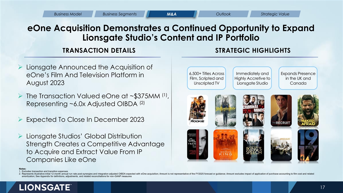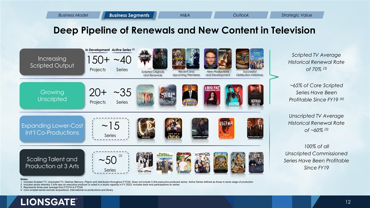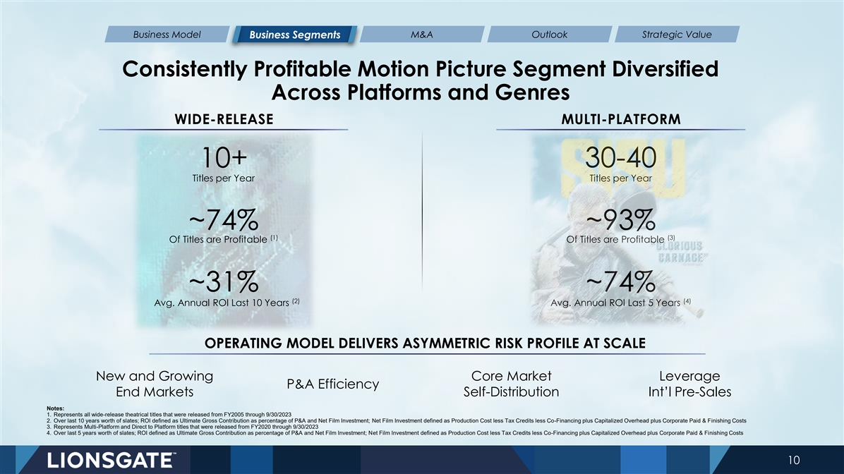 Business Model M&A Outlook Strategic Value Business Segments Consistently Profitable Motion Picture Segment Diversified Across Platforms and Genres WIDE-RELEASE MULTI-PLATFORM 10+ 30-40 Titles per Year Titles per Year ~74% ~93% (1) (3) Of Titles are Profitable Of Titles are Profitable ~31% ~74% (2) (4) Avg. Annual ROI Last 10 Years Avg. Annual ROI Last 5 Years OPERATING MODEL DELIVERS ASYMMETRIC RISK PROFILE AT SCALE New and Growing Core Market Leverage P&A Efficiency End Markets Self-Distribution Int’l Pre-Sales Notes: 1. Represents all wide-release theatrical titles that were released from FY2005 through 9/30/2023 2. Over last 10 years worth of slates; ROI defined as Ultimate Gross Contribution as percentage of P&A and Net Film Investment; Net Film Investment defined as Production Cost less Tax Credits less Co-Financing plus Capitalized Overhead plus Corporate Paid & Finishing Costs 3. Represents Multi-Platform and Direct to Platform titles that were released from FY2020 through 9/30/2023 4. Over last 5 years worth of slates; ROI defined as Ultimate Gross Contribution as percentage of P&A and Net Film Investment; Net Film Investment defined as Production Cost less Tax Credits less Co-Financing plus Capitalized Overhead plus Corporate Paid & Finishing Costs 10