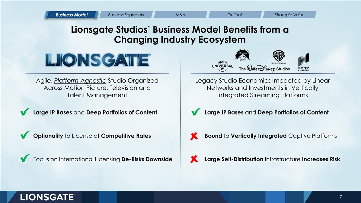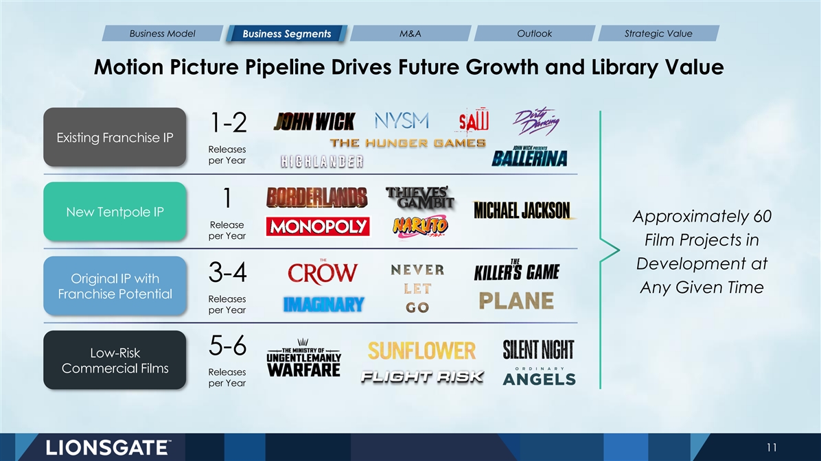 Business Model M&A Outlook Strategic Value Business Segments Motion Picture Pipeline Drives Future Growth and Library Value 1-2 Existing Franchise IP Releases per Year 1 New Tentpole IP Approximately 60 Release per Year Film Projects in Development at 3-4 Original IP with Any Given Time Franchise Potential Releases per Year 5-6 Low-Risk Commercial Films Releases per Year 11