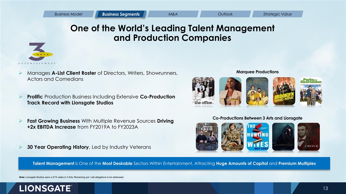 Business Model M&A Outlook Strategic Value Business Segments Deep Pipeline of Renewals and New Content in Television (1) In Development Active Series Scripted TV Average Increasing 150+ ~40 Historical Renewal Rate SETH ROGEN Scripted Output COMEDY (3) of 70% Projects Series Scripted Originals Recent and New Productions Successful Upcoming Premieres and Development Distribution Initiatives and Renewals ~65% of Core Scripted Growing Series Have Been 20+ ~35 (4) Unscripted Profitable Since FY19 Projects Series Unscripted TV Average Historical Renewal Rate Expanding Lower-Cost ~15 (3) of ~60% Int‘l Co-Productions Series 100% of all Unscripted Commissioned (2) Scaling Talent and Series Have Been Profitable ~50 Production at 3 Arts Since FY19 Series Notes: 1. Includes Scripted TV, Unscripted TV, Debmar Mercury, Pilgrim and distribution throughout FY23A. Does not include 3 Arts executive produced series. Active Series defined as those in some stage of production 2. Includes series whereby 3 Arts was an executive producer or acted in a studio capacity in FY 2023; Includes back-end participations on series 3. Represents three-year average from FY21A to FY23A 4. Core scripted series exclude acquisitions, international co-productions and library 12