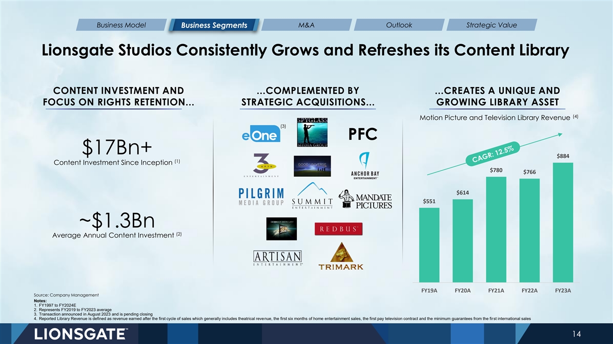 Business Model M&A Outlook Strategic Value Business Segments One of the World’s Leading Talent Management and Production Companies Marquee Productions ➢ Manages A-List Client Roster of Directors, Writers, Showrunners, Actors and Comedians ➢ Prolific Production Business Including Extensive Co-Production Track Record with Lionsgate Studios Co-Productions Between 3 Arts and Lionsgate ➢ Fast Growing Business With Multiple Revenue Sources Driving +2x EBITDA Increase from FY2019A to FY2023A ➢ 30 Year Operating History, Led by Industry Veterans Talent Management is One of the Most Desirable Sectors Within Entertainment, Attracting Huge Amounts of Capital and Premium Multiples Note: Lionsgate Studios owns a 51% stake in 3 Arts; Remaining put / call obligations to be addressed 13