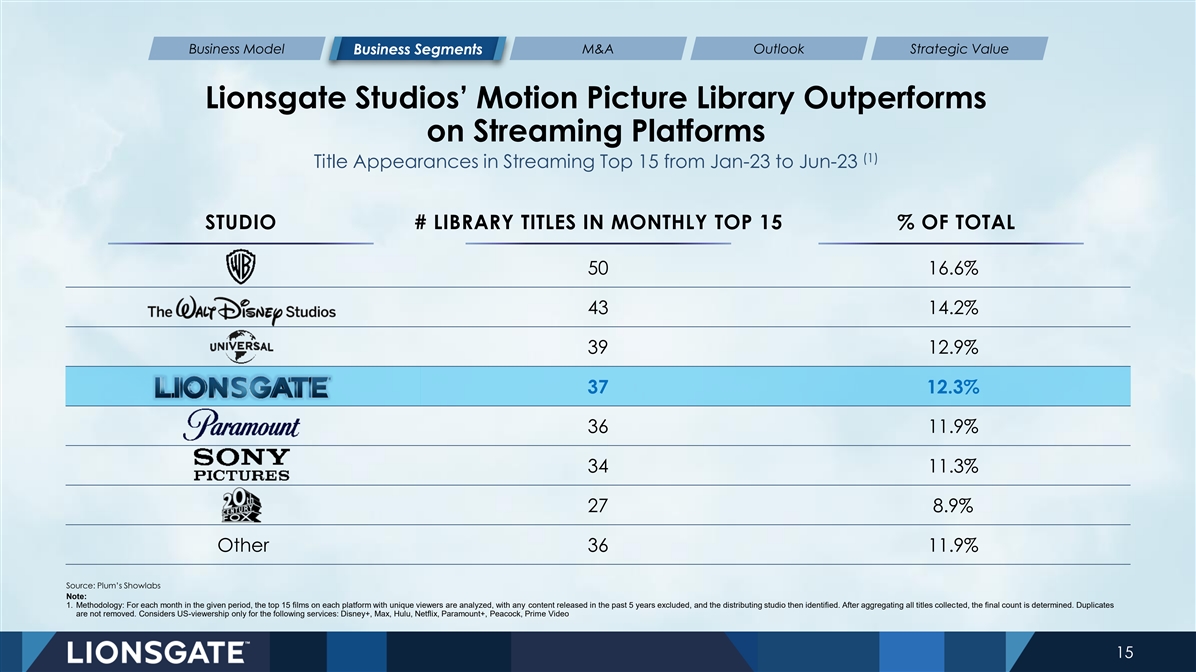 Business Model M&A Outlook Strategic Value Business Segments Lionsgate Studios Consistently Grows and Refreshes its Content Library CONTENT INVESTMENT AND ...COMPLEMENTED BY ...CREATES A UNIQUE AND FOCUS ON RIGHTS RETENTION... STRATEGIC ACQUISITIONS... GROWING LIBRARY ASSET (4) Motion Picture and Television Library Revenue (3) PFC $17Bn+ $884 (1) Content Investment Since Inception $780 $766 $614 $551 ~$1.3Bn (2) Average Annual Content Investment FY19A FY20A FY21A FY22A FY23A Source: Company Management Notes: 1. FY1997 to FY2024E 2. Represents FY2019 to FY2023 average 3. Transaction announced in August 2023 and is pending closing 4. Reported Library Revenue is defined as revenue earned after the first cycle of sales which generally includes theatrical revenue, the first six months of home entertainment sales, the first pay television contract and the minimum guarantees from the first international sales 14