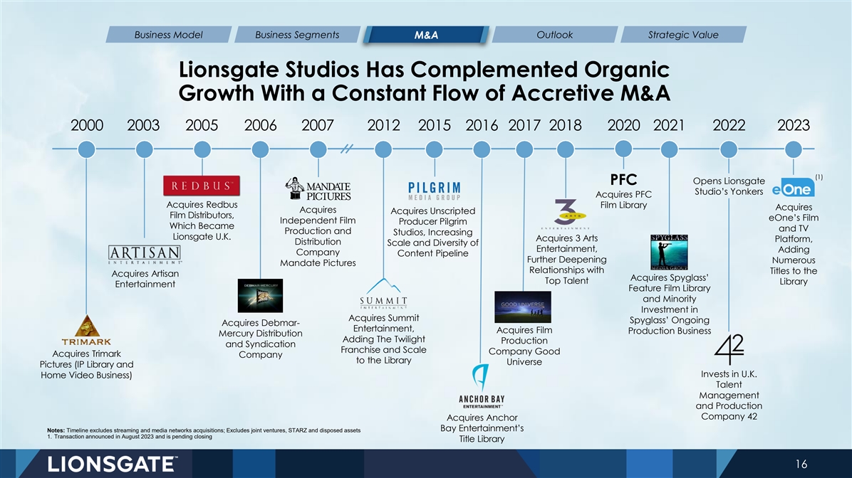 Business Model M&A Outlook Strategic Value Business Segments Lionsgate Studios’ Motion Picture Library Outperforms on Streaming Platforms (1) Title Appearances in Streaming Top 15 from Jan-23 to Jun-23 STUDIO # LIBRARY TITLES IN MONTHLY TOP 15 % OF TOTAL 50 16.6% 43 14.2% 39 12.9% 37 12.3% 36 11.9% 34 11.3% 27 8.9% Other 36 11.9% Source: Plum’s Showlabs Note: 1. Methodology: For each month in the given period, the top 15 films on each platform with unique viewers are analyzed, with any content released in the past 5 years excluded, and the distributing studio then identified. After aggregating all titles collected, the final count is determined. Duplicates are not removed. Considers US-viewership only for the following services: Disney+, Max, Hulu, Netflix, Paramount+, Peacock, Prime Video 15