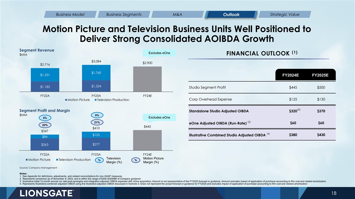 Business Model Business Segments Outlook Strategic Value M&A eOne Acquisition Demonstrates a Continued Opportunity to Expand Lionsgate Studio’s Content and IP Portfolio TRANSACTION DETAILS STRATEGIC HIGHLIGHTS ➢ Lionsgate Announced the Acquisition of 6,500+ Titles Across Immediately and Expands Presence eOne’s Film And Television Platform in Film, Scripted and Highly Accretive to in the UK and Unscripted TV Lionsgate Studio Canada August 2023 (1) ➢ The Transaction Valued eOne at ~$375MM , (2) Representing ~6.0x Adjusted OIBDA ➢ Expected To Close In December 2023 ➢ Lionsgate Studios’ Global Distribution Strength Creates a Competitive Advantage to Acquire and Extract Value From IP Companies Like eOne Notes: 1. Excludes transaction and transition expenses 2. Represents illustrative initial 12-month annual run rate post-synergies and integration adjusted OIBDA expected with eOne acquisition; Amount is not representative of the FY2025 forecast or guidance; Amount excludes impact of application of purchase accounting to film cost and related amortization; See Appendix for definitions, adjustments, and related reconciliations for non-GAAP measures 17