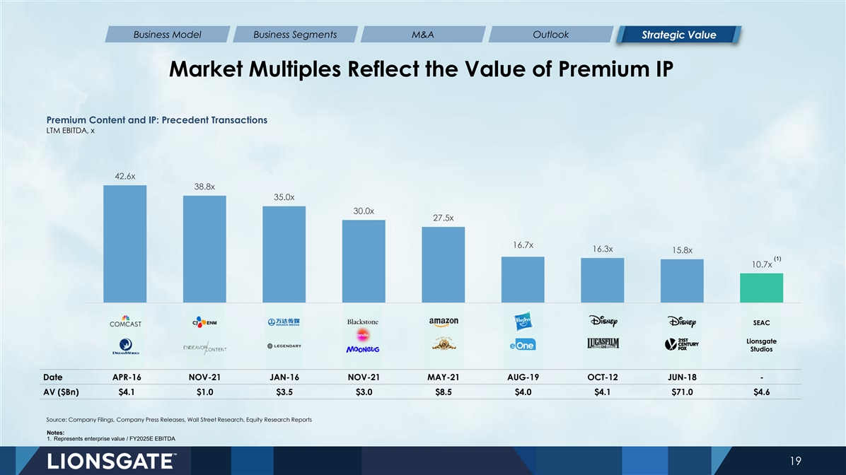 Business Model Business Segments M&A Strategic Value Outlook Motion Picture and Television Business Units Well Positioned to Deliver Strong Consolidated AOIBDA Growth Segment Revenue (1) Excludes eOne $MM FINANCIAL OUTLOOK $3,084 $2,900 $2,716 $1,760 $1,531 FY2024E FY2025E $1,324 $1,185 Studio Segment Profit $445 $500 FY22A FY23A FY24E Corp Overhead Expense $125 $130 Motion Picture Television Production (2) Segment Profit and Margin Standalone Studio Adjusted OIBDA $320 $370 $MM 8% Excludes eOne 5% (3) 21% eOne Adjusted OIBDA (Run-Rate) $60 $60 22% $445 $410 $347 (4) $133 Illustrative Combined Studio Adjusted OIBDA $380 $430 $84 $277 $263 FY22A FY23A FY24E Television Motion Picture Motion Picture Television Production % % Margin (%) Margin (%) Source: Company Management Notes: 1. See Appendix for definitions, adjustments, and related reconciliations for non-GAAP measures 2. Represents consensus as of November 9, 2023, and is within the range of $300-$350MM of Company guidance 3. Illustrative initial 12-month annual run rate post-synergies and integration adjusted OIBDA expected with eOne acquisition; Amount is not representative of the FY2025 forecast or guidance; Amount excludes impact of application of purchase accounting to film cost and related amortization 4. Represents Illustrative combined adjusted OIBDA using the illustrative adjusted OIBDA discussed in footnote 3; Does not represent the actual forecast or guidance for FY2025 and excludes impact of application of purchase accounting to film cost and related amortization 18