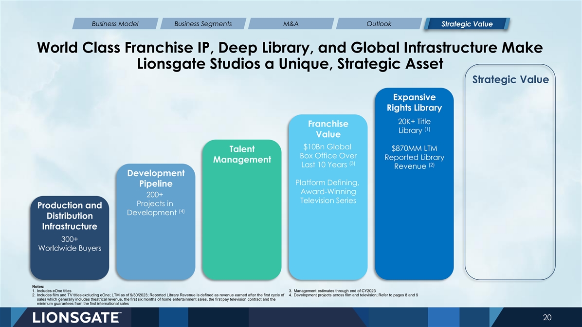 Business Model Business Segments M&A Outlook Strategic Value Market Multiples Reflect the Value of Premium IP Premium Content and IP: Precedent Transactions LTM EBITDA, x 42.6x 38.8x 35.0x 30.0x 27.5x 16.7x 16.3x 15.8x (1) 10.7x SEAC Lionsgate Studios Date APR-16 NOV-21 JAN-16 NOV-21 MAY-21 AUG-19 OCT-12 JUN-18 - AV ($Bn) $4.1 $1.0 $3.5 $3.0 $8.5 $4.0 $4.1 $71.0 $4.6 Source: Company Filings, Company Press Releases, Wall Street Research, Equity Research Reports Notes: 1. Represents enterprise value / FY2025E EBITDA 19