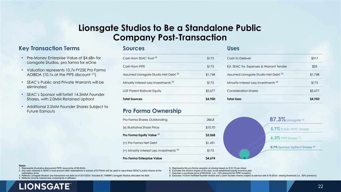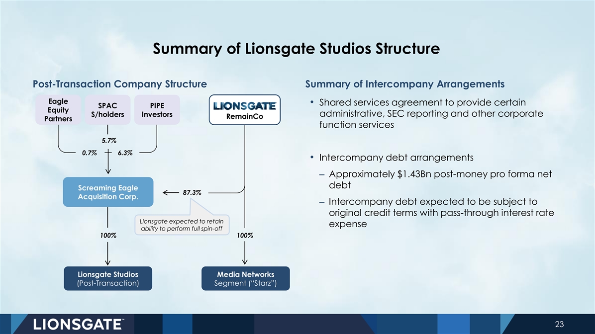 Lionsgate Studios to Be a Standalone Public Company Post-Transaction Key Transaction Terms Sources Uses (2) • Pre-Money Enterprise Value of $4.6Bn for Cash from SEAC Trust $175 Cash to Delever $317 Lionsgate Studios, pro forma for eOne Cash from PIPE $175 Est. SEAC Trx. Expenses & Warrant Tender $33 • Valuation represents 10.7x FY25E Pro Forma (3) (3) (1) Assumed Lionsgate Studio Net Debt $1,748 Assumed Lionsgate Studio Net Debt $1,748 AOIBDA (10.1x at the PIPE discount ) (4) (4) • SEAC’s Public and Private Warrants will be Minority Interest Less Investments $175 Minority Interest Less Investments $175 eliminated LGF Parent Rollover Equity $2,677 Consideration Shares $2,677 • SEAC’s Sponsor will forfeit 14.5MM Founder Total Sources $4,950 Total Uses $4,950 Shares, with 2.0MM Retained Upfront • Additional 2.2MM Founder Shares Subject to Future Earnouts Pro Forma Ownership (6) Pro Forma Shares Outstanding 286.8 87.3% Lionsgate (x) Illustrative Share Price $10.70 5.7% Public SPAC Shares (5) Pro Forma Equity Value $3,068 (7) 6.3% PIPE Shares (+) Pro Forma Net Debt $1,431 (8) 0.7% Sponsor Upfront Shares (4) (+) Minority Interest Less Investments $175 Pro Forma Enterprise Value $4,674 Notes: 1. Represents illustrative discounted PIPE issue price of $9.63/sh. 5. Represents the pro forma valuation at closing based on $10.70 per share 2. Any cash retained in SEAC's trust account after redemptions in excess of $175mm will be used to repurchase SEAC's public shares at the 6. Excludes the dilutive impact of the new, to-be-established equity incentive plan redemption price 7. Assumes a purchase price of $9.63/sh. (i.e., 10% discount) for PIPE investors 3. Reflects Lionsgate Studios' pre-transaction net debt as of 3/31/2024. Includes $1,748MM Lionsgate Studios allocated net debt 8. Excludes 14.5mm forfeited founder shares and 2.2mm founder shares subject to earnout with $16.05/sh. vesting threshold (i.e., 50% premium) 4. Reflects minority interest less investments in affiliates 22