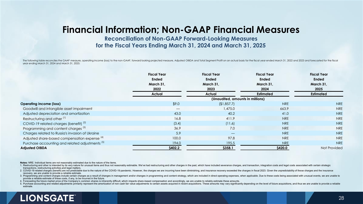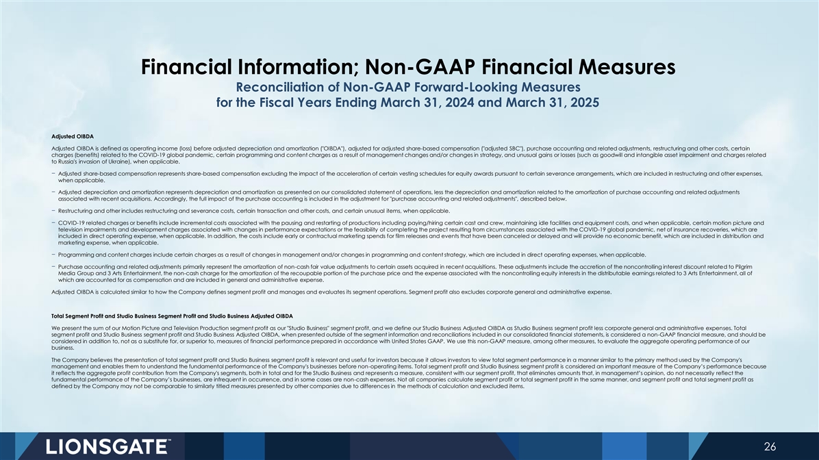 Financial Information; Non-GAAP Financial Measures Reconciliation of Non-GAAP Forward-Looking Measures for the Fiscal Years Ending March 31, 2024 and March 31, 2025 Adjusted OIBDA Adjusted OIBDA is defined as operating income (loss) before adjusted depreciation and amortization ( OIBDA ), adjusted for adjusted share-based compensation ( adjusted SBC ), purchase accounting and related adjustments, restructuring and other costs, certain charges (benefits) related to the COVID-19 global pandemic, certain programming and content charges as a result of management changes and/or changes in strategy, and unusual gains or losses (such as goodwill and intangible asset impairment and charges related to Russia's invasion of Ukraine), when applicable. − Adjusted share-based compensation represents share-based compensation excluding the impact of the acceleration of certain vesting schedules for equity awards pursuant to certain severance arrangements, which are included in restructuring and other expenses, when applicable. − Adjusted depreciation and amortization represents depreciation and amortization as presented on our consolidated statement of operations, less the depreciation and amortization related to the amortization of purchase accounting and related adjustments associated with recent acquisitions. Accordingly, the full impact of the purchase accounting is included in the adjustment for purchase accounting and related adjustments , described below. − Restructuring and other includes restructuring and severance costs, certain transaction and other costs, and certain unusual items, when applicable. − COVID-19 related charges or benefits include incremental costs associated with the pausing and restarting of productions including paying/hiring certain cast and crew, maintaining idle facilities and equipment costs, and when applicable, certain motion picture and television impairments and development charges associated with changes in performance expectations or the feasibility of completing the project resulting from circumstances associated with the COVID-19 global pandemic, net of insurance recoveries, which are included in direct operating expense, when applicable. In addition, the costs include early or contractual marketing spends for film releases and events that have been canceled or delayed and will provide no economic benefit, which are included in distribution and marketing expense, when applicable. − Programming and content charges include certain charges as a result of changes in management and/or changes in programming and content strategy, which are included in direct operating expenses, when applicable. − Purchase accounting and related adjustments primarily represent the amortization of non-cash fair value adjustments to certain assets acquired in recent acquisitions. These adjustments include the accretion of the noncontrolling interest discount related to Pilgrim Media Group and 3 Arts Entertainment, the non-cash charge for the amortization of the recoupable portion of the purchase price and the expense associated with the noncontrolling equity interests in the distributable earnings related to 3 Arts Entertainment, all of which are accounted for as compensation and are included in general and administrative expense. Adjusted OIBDA is calculated similar to how the Company defines segment profit and manages and evaluates its segment operations. Segment profit also excludes corporate general and administrative expense. Total Segment Profit and Studio Business Segment Profit and Studio Business Adjusted OIBDA We present the sum of our Motion Picture and Television Production segment profit as our Studio Business segment profit, and we define our Studio Business Adjusted OIBDA as Studio Business segment profit less corporate general and administrative expenses. Total segment profit and Studio Business segment profit and Studio Business Adjusted OIBDA, when presented outside of the segment information and reconciliations included in our consolidated financial statements, is considered a non-GAAP financial measure, and should be considered in addition to, not as a substitute for, or superior to, measures of financial performance prepared in accordance with United States GAAP. We use this non-GAAP measure, among other measures, to evaluate the aggregate operating performance of our business. The Company believes the presentation of total segment profit and Studio Business segment profit is relevant and useful for investors because it allows investors to view total segment performance in a manner similar to the primary method used by the Company's management and enables them to understand the fundamental performance of the Company's businesses before non-operating items. Total segment profit and Studio Business segment profit is considered an important measure of the Company’s performance because it reflects the aggregate profit contribution from the Company's segments, both in total and for the Studio Business and represents a measure, consistent with our segment profit, that eliminates amounts that, in management’s opinion, do not necessarily reflect the fundamental performance of the Company’s businesses, are infrequent in occurrence, and in some cases are non-cash expenses. Not all companies calculate segment profit or total segment profit in the same manner, and segment profit and total segment profit as defined by the Company may not be comparable to similarly titled measures presented by other companies due to differences in the methods of calculation and excluded items. 26