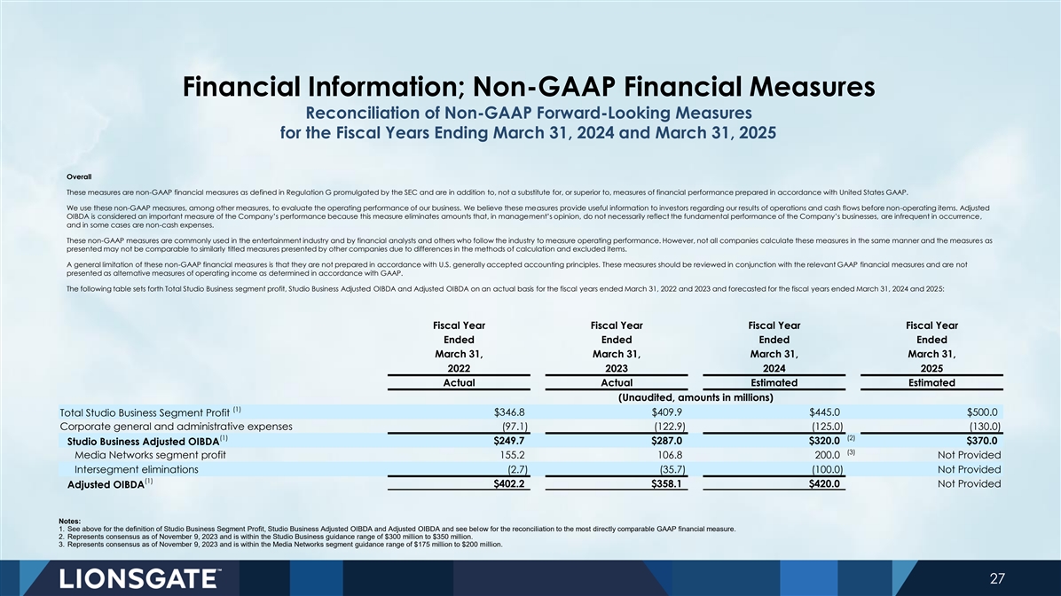 Financial Information; Non-GAAP Financial Measures Reconciliation of Non-GAAP Forward-Looking Measures for the Fiscal Years Ending March 31, 2024 and March 31, 2025 Overall These measures are non-GAAP financial measures as defined in Regulation G promulgated by the SEC and are in addition to, not a substitute for, or superior to, measures of financial performance prepared in accordance with United States GAAP. We use these non-GAAP measures, among other measures, to evaluate the operating performance of our business. We believe these measures provide useful information to investors regarding our results of operations and cash flows before non-operating items. Adjusted OIBDA is considered an important measure of the Company’s performance because this measure eliminates amounts that, in management’s opinion, do not necessarily reflect the fundamental performance of the Company’s businesses, are infrequent in occurrence, and in some cases are non-cash expenses. These non-GAAP measures are commonly used in the entertainment industry and by financial analysts and others who follow the industry to measure operating performance. However, not all companies calculate these measures in the same manner and the measures as presented may not be comparable to similarly titled measures presented by other companies due to differences in the methods of calculation and excluded items. A general limitation of these non-GAAP financial measures is that they are not prepared in accordance with U.S. generally accepted accounting principles. These measures should be reviewed in conjunction with the relevant GAAP financial measures and are not presented as alternative measures of operating income as determined in accordance with GAAP. The following table sets forth Total Studio Business segment profit, Studio Business Adjusted OIBDA and Adjusted OIBDA on an actual basis for the fiscal years ended March 31, 2022 and 2023 and forecasted for the fiscal years ended March 31, 2024 and 2025: Fiscal Year Fiscal Year Fiscal Year Fiscal Year Ended Ended Ended Ended March 31, March 31, March 31, March 31, 2022 2023 2024 2025 Actual Actual Estimated Estimated (Unaudited, amounts in millions) (1) Total Studio Business Segment Profit $346.8 $409.9 $445.0 $500.0 Corporate general and administrative expenses (97.1) (122.9) (125.0) (130.0) (1) (2) $249.7 $287.0 $320.0 $370.0 Studio Business Adjusted OIBDA (3) Media Networks segment profit 155.2 106.8 200.0 Not Provided Intersegment eliminations (2.7) (35.7) (100.0) Not Provided (1) $402.2 $358.1 $420.0 Not Provided Adjusted OIBDA Notes: 1. See above for the definition of Studio Business Segment Profit, Studio Business Adjusted OIBDA and Adjusted OIBDA and see below for the reconciliation to the most directly comparable GAAP financial measure. 2. Represents consensus as of November 9, 2023 and is within the Studio Business guidance range of $300 million to $350 million. 3. Represents consensus as of November 9, 2023 and is within the Media Networks segment guidance range of $175 million to $200 million. 27