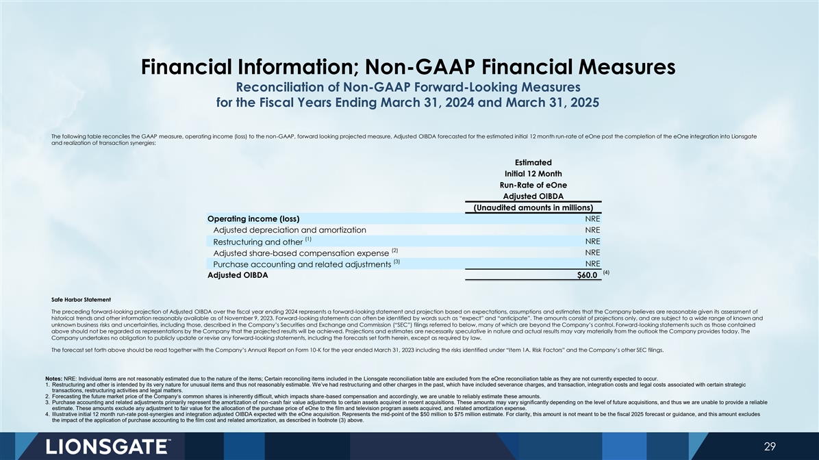 Financial Information; Non-GAAP Financial Measures Reconciliation of Non-GAAP Forward-Looking Measures for the Fiscal Years Ending March 31, 2024 and March 31, 2025 The following table reconciles the GAAP measure, operating income (loss) to the non-GAAP, forward looking projected measure, Adjusted OIBDA forecasted for the estimated initial 12 month run-rate of eOne post the completion of the eOne integration into Lionsgate and realization of transaction synergies: Estimated Initial 12 Month Run-Rate of eOne Adjusted OIBDA (Unaudited amounts in millions) Operating income (loss) NRE Adjusted depreciation and amortization NRE (1) Restructuring and other NRE (2) NRE Adjusted share-based compensation expense (3) NRE Purchase accounting and related adjustments (4) Adjusted OIBDA $60.0 Safe Harbor Statement The preceding forward-looking projection of Adjusted OIBDA over the fiscal year ending 2024 represents a forward-looking statement and projection based on expectations, assumptions and estimates that the Company believes are reasonable given its assessment of historical trends and other information reasonably available as of November 9, 2023. Forward-looking statements can often be identified by words such as “expect” and “anticipate”. The amounts consist of projections only, and are subject to a wide range of known and unknown business risks and uncertainties, including those, described in the Company’s Securities and Exchange and Commission (“SEC”) filings referred to below, many of which are beyond the Company’s control. Forward-looking statements such as those contained above should not be regarded as representations by the Company that the projected results will be achieved. Projections and estimates are necessarily speculative in nature and actual results may vary materially from the outlook the Company provides today. The Company undertakes no obligation to publicly update or revise any forward-looking statements, including the forecasts set forth herein, except as required by law. The forecast set forth above should be read together with the Company’s Annual Report on Form 10-K for the year ended March 31, 2023 including the risks identified under “Item 1A. Risk Factors” and the Company’s other SEC filings. Notes: NRE: Individual items are not reasonably estimated due to the nature of the items; Certain reconciling items included in the Lionsgate reconciliation table are excluded from the eOne reconciliation table as they are not currently expected to occur. 1. Restructuring and other is intended by its very nature for unusual items and thus not reasonably estimable. We’ve had restructuring and other charges in the past, which have included severance charges, and transaction, integration costs and legal costs associated with certain strategic transactions, restructuring activities and legal matters. 2. Forecasting the future market price of the Company’s common shares is inherently difficult, which impacts share-based compensation and accordingly, we are unable to reliably estimate these amounts. 3. Purchase accounting and related adjustments primarily represent the amortization of non-cash fair value adjustments to certain assets acquired in recent acquisitions. These amounts may vary significantly depending on the level of future acquisitions, and thus we are unable to provide a reliable estimate. These amounts exclude any adjustment to fair value for the allocation of the purchase price of eOne to the film and television program assets acquired, and related amortization expense. 4. Illustrative initial 12 month run-rate post-synergies and integration adjusted OIBDA expected with the eOne acquisition. Represents the mid-point of the $50 million to $75 million estimate. For clarity, this amount is not meant to be the fiscal 2025 forecast or guidance, and this amount excludes the impact of the application of purchase accounting to the film cost and related amortization, as described in footnote (3) above. 29