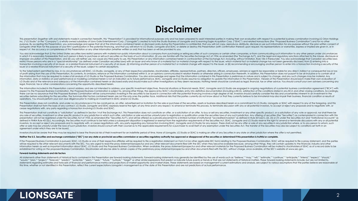 Disclaimer This presentation (together with oral statements made in connection herewith, this “Presentation”) is provided for informational purposes only and has been prepared to assist interested parties in making their own evaluation with respect to a potential business combination involving LG Orion Holdings Inc. (“LG Studio” or the “Company”), a wholly owned subsidiary of Lions Gate Entertainment Corp. (“Lionsgate”) created to hold the Studio Business of Lionsgate and Screaming Eagle Acquisition Corp. (“SEAC”) and related transactions (the “Proposed Business Combination”) and for no other purpose. By accepting this Presentation, you acknowledge and agree that all of the information contained herein or disclosed orally during this Presentation is confidential, that you will not copy, reproduce, distribute, disclose or use such information for any purpose without the prior written consent of Lionsgate other than for the purpose of your firm’s participation in the potential financing, and that you will return to LG Studio, Lionsgate and SEAC or delete or destroy this Presentation (with confirmation thereof) upon request. No representations or warranties, express or implied are given in, or in respect of, the accuracy or completeness of this Presentation or any other information (whether written or oral) that has been or will be provided to you. You also acknowledge that (i) the United States securities laws restrict persons with material non-public information about a company from purchasing or selling securities of such company or certain other companies, or from communicating such information to any other person under circumstances in which it is reasonably foreseeable that such person is likely to purchase or sell such securities on the basis of such information, (ii) you are familiar with the Securities Exchange Act of 1934, as amended (the Exchange Act ), and the legal and regulatory sanctions attached to the misuse, disclosure or improper circulation of this Presentation, and (iii) you will neither use, nor cause any third party to use, this Presentation or any information contained herein in contravention of the Exchange Act, including, without limitation, Rule 10b-5 thereunder. You also acknowledge that Canadian securities laws restrict those persons who are in a “special relationship” (as defined under Canadian securities laws) with an issuer and who know of a material fact or material change with respect to the issuer, which material fact or material change has not been generally disclosed, from (i) entering into a transaction involving a security of an issuer, or a related financial instrument of a security of an issuer, (ii) informing another person of a material fact or material change with respect to the issuer, or (iii) recommending or encouraging another person to enter into a transaction involving a security of the issuer or a related financial instrument of a security of the issuer, subject to certain exceptions. To the fullest extent permitted by law, in no circumstances will SEAC, LG Studio, Lionsgate, or any of their respective subsidiaries, stockholders, affiliates, representatives, partners, directors, officers, employees, advisers or agents be responsible or liable for any direct, indirect or consequential loss or loss of profit arising from the use of this Presentation, its contents, its omissions, reliance on the information contained within it, or on opinions communicated in relation thereto or otherwise arising in connection therewith. In addition, this Presentation does not purport to be all-inclusive or to contain all of the information that may be required to make a full analysis of LG Studio or the Proposed Business Combination. You also acknowledge and agree that the information contained in this Presentation is preliminary in nature and is subject to change, and any such changes may be material. Any information, data or statistics on past performance or modeling contained herein is not an indication as to future performance. SEAC, Lionsgate and LG Studio assume no obligation to update the information in this Presentation. Viewers of this Presentation should each make their own evaluation of LG Studio and of the relevance and adequacy of the information contained herein or disclosed orally and should make such other investigations as they deem necessary. Nothing herein should be construed as legal, financial, tax or other advice. You should consult your own advisers concerning any legal, financial, tax or other considerations concerning the opportunity described herein. The information included in this Presentation cannot address, and are not intended to address, your specific investment objectives, financial situations or financial needs. SEAC, Lionsgate and LG Studio are engaged in ongoing negotiations of a potential business combination agreement (“BCA”) with respect to the Proposed Business Combination. The Proposed Business Combination is subject to, among other things, the approval by SEAC’s stockholders, entry into definitive documentation (including a BCA), satisfaction of the conditions stated in any BCA and other closing conditions. Accordingly, there can be no assurance that the Proposed Business Combination will be consummated. Investing in the securities to be issued in connection with the potential financing involves a high degree of risk. Investors should carefully consider the risks and uncertainties inherent in an investment in the securities before subscribing for the securities. The Summary Risk Factors contained herein are not the only ones the parties face. Additional risks that the parties currently do not know about or that they currently believe to be immaterial may also impair their business, financial condition or results of operations. You should perform your own due diligence prior to making an investment in SEAC and/or LG Studio. This Presentation does not constitute, and under no circumsta