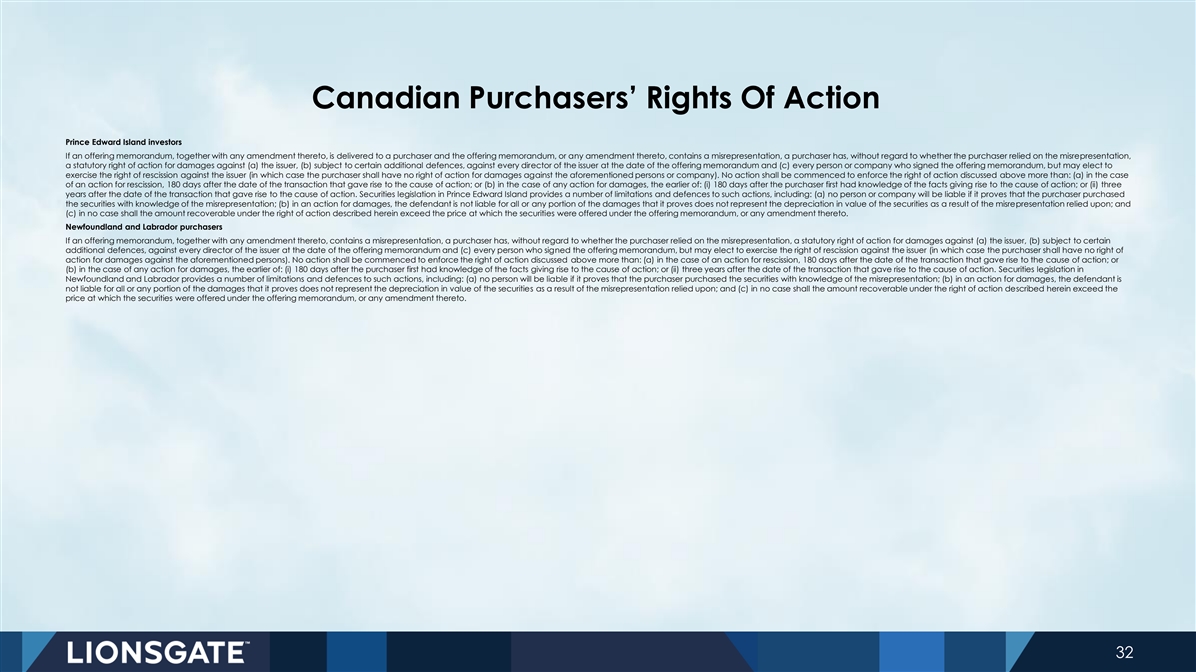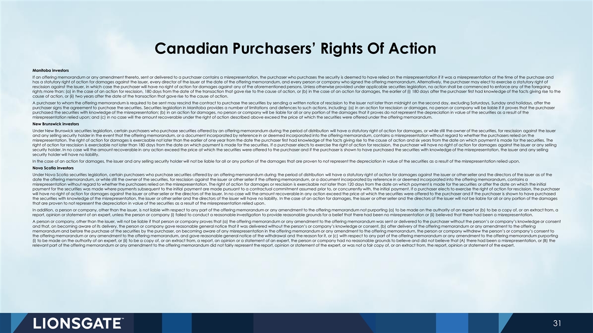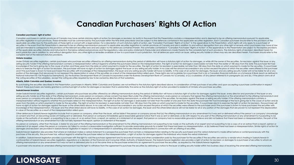 Canadian Purchasers’ Rights Of Action Canadian purchasers’ right of action Canadian purchasers in certain provinces of Canada may have certain statutory rights of action for damages or rescission (or both) in the event that this Presentation contains a misrepresentation and is deemed to be an offering memorandum pursuant to applicable securities legislation in such provinces. These remedies must be commenced by the purchaser within the time limits prescribed and are subject to the defences contained in the applicable securities legislation. Each Canadian purchaser should refer to the provisions of the applicable securities laws for the particulars of these rights or consult with a legal advisor. For a description of such statutory rights of action, see “Canadian Purchasers’ Rights of Action” in the appendices to this Presentation, which rights will only apply to a purchaser of securities in the event that this Presentation is deemed to be an offering memorandum pursuant to applicable securities legislation in certain provinces of Canada and are in addition to and without derogation from any other right or remedy which purchasers may have at law and are intended to correspond to the provisions of the relevant securities laws and are subject to the defences contained therein. The summaries contained in “Canadian Purchasers’ Rights of Action” in the appendices to this Presentation are subject to the express provisions of the applicable securities statutes and instruments in the below-referenced provinces and the regulations, rules and policy statements thereunder and reference is made thereto for the complete text of such provisions. The statutory rights of rescission described herein for each jurisdiction are in addition to, and without derogation from, any other rights or remedies available at law to a purchaser in such jurisdiction. Not all defences upon which an issuer, selling security holder or others may rely are described herein. Purchasers should refer to the complete text of the relevant statutory provisions. Ontario Investors Under Ontario securities legislation, certain purchasers who purchase securities offered by an offering memorandum during the period of distribution will have a statutory right of action for damages, or while still the owner of the securities, for rescission against the issuer or any selling security holder if the offering memorandum contains a misrepresentation without regard to whether the purchasers relied on the misrepresentation. The right of action for damages is exercisable not later than the earlier of 180 days from the date the purchaser first had knowledge of the facts giving rise to the cause of action and three years from the date on which payment is made for the securities. The right of action for rescission is exercisable not later than 180 days from the date on which payment is made for the securities. If a purchaser elects to exercise the right of action for rescission, the purchaser will have no right of action for damages against the issuer or any selling security holder. In no case will the amount recoverable in any action exceed the price at which the securities were offered to the purchaser and if the purchaser is shown to have purchased the securities with knowledge of the misrepresentation, the issuer and any selling security holder will have no liability. In the case of an action for damages, the issuer and any selling security holder will not be liable for all or any portion of the damages that are proven to not represent the depreciation in value of the securities as a result of the misrepresentation relied upon. These rights are not available for a purchaser that is (a) a Canadian financial institution or a Schedule III Bank (each as defined in National Instrument 45-106 Prospectus Exemptions), (b) the Business Development Bank of Canada incorporated under the Business Development Bank of Canada Act (Canada), or (c) a subsidiary of any person referred to in paragraphs (a) and (b), if the person owns all of the voting securities of the subsidiary, except the voting securities required by law to be owned by directors of that subsidiary. Alberta, British Columbia and Quebec investors By purchasing the securities described in this Presentation, purchasers in Alberta, British Columbia and Quebec are not entitled to the statutory rights described above. In consideration of their purchase of securities and upon accepting a purchase confirmation in respect thereof, these purchasers are hereby granted a contractual right of action for damages or rescission that is substantially the same as the statutory right of action provided to residents of Ontario who purchase securities. Saskatchewan investors Under Saskatchewan securities legislation, certain purchasers who purchase securities offered by an offering memorandum during the period of distribution will have a statutory right of action for damages against the issuer, every director and promoter of the issuer or any selling security holder as of the date of the offering memorandum, every person or company whose consent has been filed under the offering memorandum, every person or company that signed the offering memorandum or the amendment to the offering memorandum and every person or company who sells the securities on behalf of the issuer or selling security holder under the offering memorandum, or while still the owner of the securities, for rescission against the issuer or selling security holder, if the offering memorandum contains a misrepresentation without regard to whether the purchasers relied on the misrepresentation. The right of action for damages is exercisable not later than the earlier of one year from the date the purchaser first had knowledge of the facts giving rise to the cause of action and six years from the date on which payment is made for the securities. The right of action for rescission is exercisable not later than 180 days from the date on which