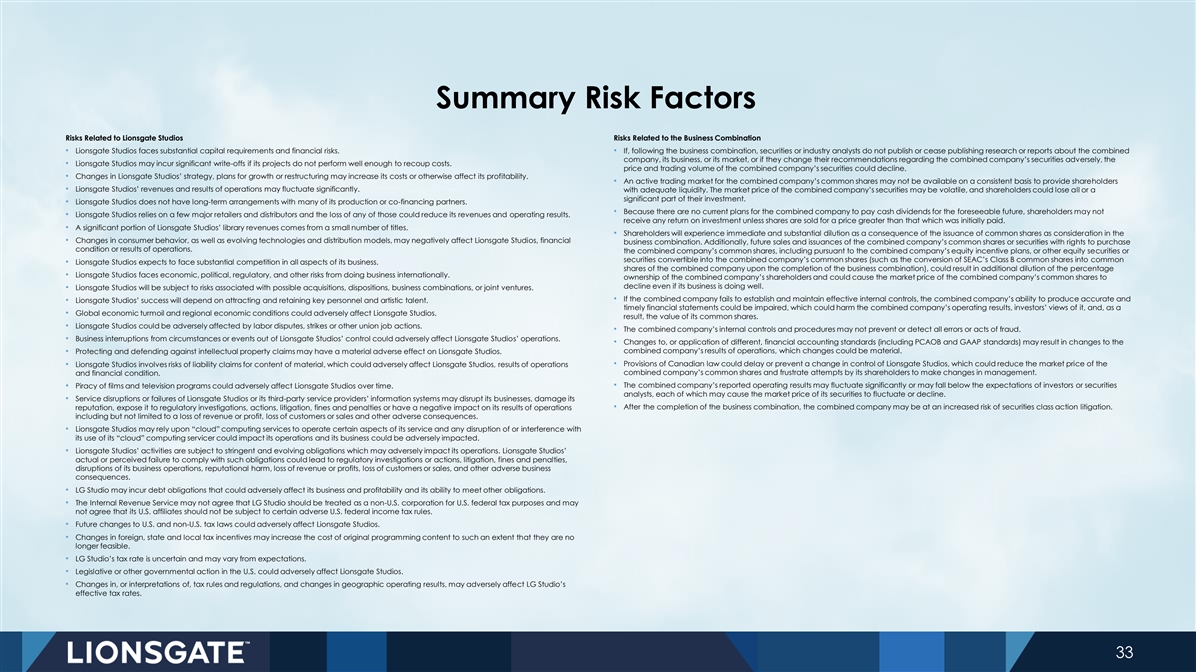 Summary Risk Factors Risks Related to Lionsgate Studios Risks Related to the Business Combination • Lionsgate Studios faces substantial capital requirements and financial risks. • If, following the business combination, securities or industry analysts do not publish or cease publishing research or reports about the combined company, its business, or its market, or if they change their recommendations regarding the combined company’s securities adversely, the • Lionsgate Studios may incur significant write-offs if its projects do not perform well enough to recoup costs. price and trading volume of the combined company’s securities could decline. • Changes in Lionsgate Studios’ strategy, plans for growth or restructuring may increase its costs or otherwise affect its profitability. • An active trading market for the combined company’s common shares may not be available on a consistent basis to provide shareholders • Lionsgate Studios’ revenues and results of operations may fluctuate significantly. with adequate liquidity. The market price of the combined company’s securities may be volatile, and shareholders could lose all or a significant part of their investment. • Lionsgate Studios does not have long-term arrangements with many of its production or co-financing partners. • Because there are no current plans for the combined company to pay cash dividends for the foreseeable future, shareholders may not • Lionsgate Studios relies on a few major retailers and distributors and the loss of any of those could reduce its revenues and operating results. receive any return on investment unless shares are sold for a price greater than that which was initially paid. • A significant portion of Lionsgate Studios’ library revenues comes from a small number of titles. • Shareholders will experience immediate and substantial dilution as a consequence of the issuance of common shares as consideration in the • Changes in consumer behavior, as well as evolving technologies and distribution models, may negatively affect Lionsgate Studios, financial business combination. Additionally, future sales and issuances of the combined company’s common shares or securities with rights to purchase condition or results of operations. the combined company’s common shares, including pursuant to the combined company’s equity incentive plans, or other equity securities or securities convertible into the combined company’s common shares (such as the conversion of SEAC’s Class B common shares into common • Lionsgate Studios expects to face substantial competition in all aspects of its business. shares of the combined company upon the completion of the business combination), could result in additional dilution of the percentage • Lionsgate Studios faces economic, political, regulatory, and other risks from doing business internationally. ownership of the combined company’s shareholders and could cause the market price of the combined company’s common shares to decline even if its business is doing well. • Lionsgate Studios will be subject to risks associated with possible acquisitions, dispositions, business combinations, or joint ventures. • If the combined company fails to establish and maintain effective internal controls, the combined company’s ability to produce accurate and • Lionsgate Studios’ success will depend on attracting and retaining key personnel and artistic talent. timely financial statements could be impaired, which could harm the combined company’s operating results, investors’ views of it, and, as a • Global economic turmoil and regional economic conditions could adversely affect Lionsgate Studios. result, the value of its common shares. • Lionsgate Studios could be adversely affected by labor disputes, strikes or other union job actions. • The combined company’s internal controls and procedures may not prevent or detect all errors or acts of fraud. • Business interruptions from circumstances or events out of Lionsgate Studios’ control could adversely affect Lionsgate Studios’ operations. • Changes to, or application of different, financial accounting standards (including PCAOB and GAAP standards) may result in changes to the combined company’s results of operations, which changes could be material. • Protecting and defending against intellectual property claims may have a material adverse effect on Lionsgate Studios. • Lionsgate Studios involves risks of liability claims for content of material, which could adversely affect Lionsgate Studios, results of operations • Provisions of Canadian law could delay or prevent a change in control of Lionsgate Studios, which could reduce the market price of the combined company’s common shares and frustrate attempts by its shareholders to make changes in management. and financial condition. • The combined company’s reported operating results may fluctuate significantly or may fall below the expectations of investors or securities • Piracy of films and television programs could adversely affect Lionsgate Studios over time. analysts, each of which may cause the market price of its securities to fluctuate or decline. • Service disruptions or failures of Lionsgate Studios or its third-party service providers’ information systems may disrupt its businesses, damage its • After the completion of the business combination, the combined company may be at an increased risk of securities class action litigation. reputation, expose it to regulatory investigations, actions, litigation, fines and penalties or have a negative impact on its results of operations including but not limited to a loss of revenue or profit, loss of customers or sales and other adverse consequences. • Lionsgate Studios may rely upon “cloud” computing services to operate certain aspects of its service and any disruption of or interference with its use of its “cloud” computing servicer could 