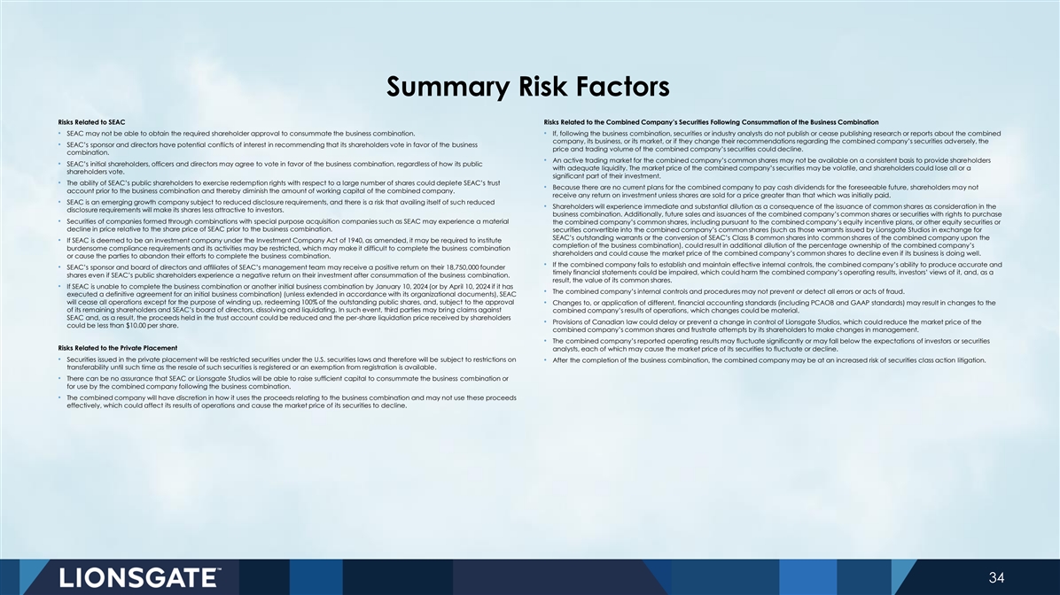 Summary Risk Factors Risks Related to SEAC Risks Related to the Combined Company’s Securities Following Consummation of the Business Combination • SEAC may not be able to obtain the required shareholder approval to consummate the business combination. • If, following the business combination, securities or industry analysts do not publish or cease publishing research or reports about the combined company, its business, or its market, or if they change their recommendations regarding the combined company’s securities adversely, the • SEAC’s sponsor and directors have potential conflicts of interest in recommending that its shareholders vote in favor of the business price and trading volume of the combined company’s securities could decline. combination. • An active trading market for the combined company’s common shares may not be available on a consistent basis to provide shareholders • SEAC’s initial shareholders, officers and directors may agree to vote in favor of the business combination, regardless of how its public with adequate liquidity. The market price of the combined company’s securities may be volatile, and shareholders could lose all or a shareholders vote. significant part of their investment. • The ability of SEAC’s public shareholders to exercise redemption rights with respect to a large number of shares could deplete SEAC’s trust • Because there are no current plans for the combined company to pay cash dividends for the foreseeable future, shareholders may not account prior to the business combination and thereby diminish the amount of working capital of the combined company. receive any return on investment unless shares are sold for a price greater than that which was initially paid. • SEAC is an emerging growth company subject to reduced disclosure requirements, and there is a risk that availing itself of such reduced • Shareholders will experience immediate and substantial dilution as a consequence of the issuance of common shares as consideration in the disclosure requirements will make its shares less attractive to investors. business combination. Additionally, future sales and issuances of the combined company’s common shares or securities with rights to purchase • Securities of companies formed through combinations with special purpose acquisition companies such as SEAC may experience a material the combined company’s common shares, including pursuant to the combined company’s equity incentive plans, or other equity securities or decline in price relative to the share price of SEAC prior to the business combination. securities convertible into the combined company’s common shares (such as those warrants issued by Lionsgate Studios in exchange for SEAC’s outstanding warrants or the conversion of SEAC’s Class B common shares into common shares of the combined company upon the • If SEAC is deemed to be an investment company under the Investment Company Act of 1940, as amended, it may be required to institute completion of the business combination), could result in additional dilution of the percentage ownership of the combined company’s burdensome compliance requirements and its activities may be restricted, which may make it difficult to complete the business combination shareholders and could cause the market price of the combined company’s common shares to decline even if its business is doing well. or cause the parties to abandon their efforts to complete the business combination. • If the combined company fails to establish and maintain effective internal controls, the combined company’s ability to produce accurate and • SEAC’s sponsor and board of directors and affiliates of SEAC’s management team may receive a positive return on their 18,750,000 founder timely financial statements could be impaired, which could harm the combined company’s operating results, investors’ views of it, and, as a shares even if SEAC’s public shareholders experience a negative return on their investment after consummation of the business combination. result, the value of its common shares. • If SEAC is unable to complete the business combination or another initial business combination by January 10, 2024 (or by April 10, 2024 if it has • The combined company’s internal controls and procedures may not prevent or detect all errors or acts of fraud. executed a definitive agreement for an initial business combination) (unless extended in accordance with its organizational documents), SEAC will cease all operations except for the purpose of winding up, redeeming 100% of the outstanding public shares, and, subject to the approval • Changes to, or application of different, financial accounting standards (including PCAOB and GAAP standards) may result in changes to the of its remaining shareholders and SEAC’s board of directors, dissolving and liquidating. In such event, third parties may bring claims against combined company’s results of operations, which changes could be material. SEAC and, as a result, the proceeds held in the trust account could be reduced and the per-share liquidation price received by shareholders • Provisions of Canadian law could delay or prevent a change in control of Lionsgate Studios, which could reduce the market price of the could be less than $10.00 per share. combined company’s common shares and frustrate attempts by its shareholders to make changes in management. • The combined company’s reported operating results may fluctuate significantly or may fall below the expectations of investors or securities Risks Related to the Private Placement analysts, each of which may cause the market price of its securities to fluctuate or decline. • Securities issued in the private placement will be restricted securities under the U.S. securities laws and therefore will be subject to restrictions on • After the completion of the business combination, the combined company may be 