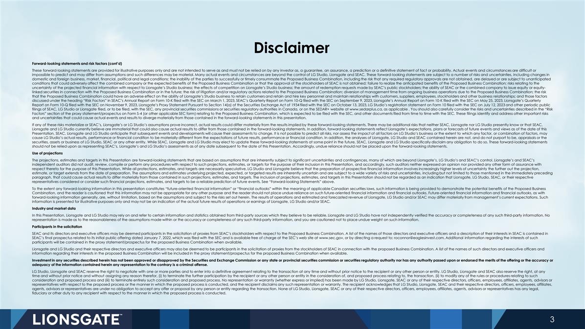 Disclaimer Forward-looking statements and risk factors (cont’d) These forward-looking statements are provided for illustrative purposes only and are not intended to serve as and must not be relied on by any investor as, a guarantee, an assurance, a prediction or a definitive statement of fact or probability. Actual events and circumstances are difficult or impossible to predict and may differ from assumptions and such differences may be material. Many actual events and circumstances are beyond the control of LG Studio, Lionsgate and SEAC. These forward-looking statements are subject to a number of risks and uncertainties, including changes in domestic and foreign business, market, financial, political and legal conditions; the inability of the parties to successfully or timely consummate the Proposed Business Combination, including the risk that any required regulatory approvals are not obtained, are delayed or are subject to unanticipated conditions that could adversely affect the combined company or the expected benefits of the Proposed Business Combination or that the approval of the stockholders of SEAC is not obtained; failure to realize the anticipated benefits of the Proposed Business Combination; risks relating to the uncertainty of the projected financial information with respect to Lionsgate’s Studio business; the effects of competition on Lionsgate’s Studio business; the amount of redemption requests made by SEAC’s public stockholders; the ability of SEAC or the combined company to issue equity or equity- linked securities in connection with the Proposed Business Combination or in the future; the risk of litigation and/or regulatory actions related to the Proposed Business Combination; diversion of management time from ongoing business operations due to the Proposed Business Combination; the risk that the Proposed Business Combination could have an adverse effect on the ability of Lionsgate’s Studio business to retain customers and retain and hire key personnel and maintain relationships with customers, suppliers, employees, stockholders and other business relationships; and those factors discussed under the heading “Risk Factors” in SEAC’s Annual Report on Form 10-K filed with the SEC on March 1, 2023, SEAC’s Quarterly Report on Form 10-Q filed with the SEC on September 9, 2023, Lionsgate’s Annual Report on Form 10-K filed with the SEC on May 25, 2023, Lionsgate’s Quarterly Report on Form 10-Q filed with the SEC on November 9, 2023, Lionsgate’s Proxy Statement Pursuant to Section 14(a) of the Securities Exchange Act of 1934 filed with the SEC on October 13, 2023, LG Studio’s registration statement on Form 10 filed with the SEC on July 12, 2023 and other periodic public filings of SEAC, LG Studio or Lionsgate filed, or to be filed, with the SEC, any provincial securities commissions or securities regulatory authorities in Canada, or on the SEDAR+ website at www.sedarplus.ca, as applicable . You should also carefully consider the risks and uncertainties described in the “Risk Factors” section of the proxy statement/prospectus on Form S-4 (or other applicable SEC form) relating to the Proposed Business Combination, which is expected to be filed with the SEC, and other documents filed from time to time with the SEC. These filings identify and address other important risks and uncertainties that could cause actual events and results to diverge materially from those contained in the forward-looking statements in this presentation. If any of these risks materialize or SEAC’s, Lionsgate’s or LG Studio’s assumptions prove incorrect, actual results could differ materially from the results implied by these forward-looking statements. There may be additional risks that neither SEAC, Lionsgate nor LG Studio presently know or that SEAC, Lionsgate and LG Studio currently believe are immaterial that could also cause actual results to differ from those contained in the forward-looking statements. In addition, forward-looking statements reflect Lionsgate’s expectations, plans or forecasts of future events and views as of the date of this Presentation. SEAC, Lionsgate and LG Studio anticipate that subsequent events and developments will cause their assessments to change. It is not possible to predict all risks, nor assess the impact of all factors on LG Studio’s business or the extent to which any factor, or combination of factors, may cause LG Studio’s actual results, performance or financial condition to be materially different from the expectations of future results, performance or financial condition. In addition, the analyses of Lionsgate, LG Studio and SEAC contained herein are not, and do not purport to be, appraisals or the securities, assets or business of LG Studio, SEAC or any other entity. While SEAC, Lionsgate and LG Studio may elect to update these forward-looking statements at some point in the future, SEAC, Lionsgate and LG Studio specifically disclaim any obligation to do so. These forward-looking statements should not be relied upon as representing SEAC’s, Lionsgate’s and LG Studio’s assessments as of any date subsequent to the date of this Presentation. Accordingly, undue reliance should not be placed upon the forward-looking statements. Use of projections The projections, estimates and targets in this Presentation are forward-looking statements that are based on assumptions that are inherently subject to significant uncertainties and contingences, many of which are beyond Lionsgate’s, LG Studio’s and SEAC’s control. Lionsgate’s and SEAC’s independent auditors did not audit, review, compile or perform any procedures with respect to such projections, estimates, or targets for the purpose of their inclusion in this Presentation, and accordingly, such auditors neither expressed an opinion nor provided any other form of assurance with respect thereto for the purpose of this Presentation. While all protections, estimates, a