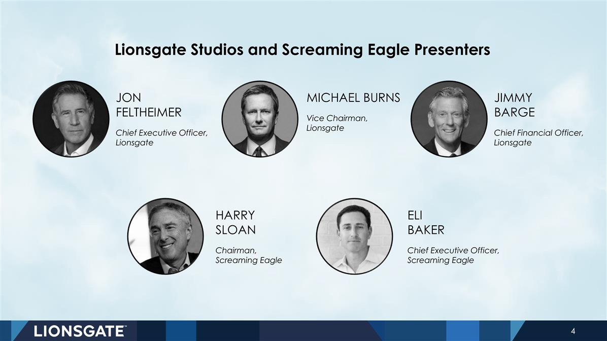 Lionsgate Studios and Screaming Eagle Presenters JON MICHAEL BURNS JIMMY FELTHEIMER BARGE Vice Chairman, Lionsgate Chief Executive Officer, Chief Financial Officer, Lionsgate Lionsgate HARRY ELI SLOAN BAKER Chairman, Chief Executive Officer, Screaming Eagle Screaming Eagle 4