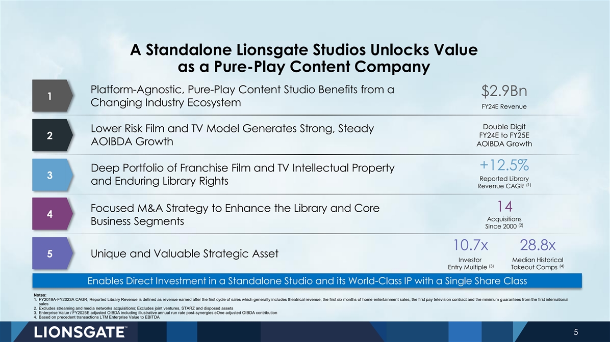 A Standalone Lionsgate Studios Unlocks Value as a Pure-Play Content Company Platform-Agnostic, Pure-Play Content Studio Benefits from a $2.9Bn 1 Changing Industry Ecosystem FY24E Revenue Double Digit Lower Risk Film and TV Model Generates Strong, Steady FY24E to FY25E 2 AOIBDA Growth AOIBDA Growth +12.5% Deep Portfolio of Franchise Film and TV Intellectual Property 3 Reported Library and Enduring Library Rights (1) Revenue CAGR Focused M&A Strategy to Enhance the Library and Core 14 4 Acquisitions Business Segments (2) Since 2000 10.7x 28.8x 5 Unique and Valuable Strategic Asset Investor Median Historical (3) (4) Entry Multiple Takeout Comps Enables Direct Investment in a Standalone Studio and its World-Class IP with a Single Share Class Notes: 1. FY2019A-FY2023A CAGR; Reported Library Revenue is defined as revenue earned after the first cycle of sales which generally includes theatrical revenue, the first six months of home entertainment sales, the first pay television contract and the minimum guarantees from the first international sales 2. Excludes streaming and media networks acquisitions; Excludes joint ventures, STARZ and disposed assets 3. Enterprise Value / FY2025E adjusted OIBDA including illustrative annual run rate post-synergies eOne adjusted OIBDA contribution 4. Based on precedent transactions LTM Enterprise Value to EBITDA 5
