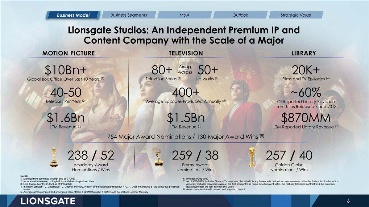 Business Segments M&A Outlook Strategic Value Business Model Lionsgate Studios: An Independent Premium IP and Content Company with the Scale of a Major MOTION PICTURE TELEVISION LIBRARY Airing Across $10Bn+ 80+ 50+ 20K+ (4) (4) (1) (6) Television Series Networks Global Box Office Over Last 10 Years Films and TV Episodes 40-50 400+ ~60% (2) (5) Releases Per Year Average Episodes Produced Annually Of Reported Library Revenue from Titles Released Since 2013 $1.6Bn $1.5Bn $870MM (3) (3) (7) LTM Revenue LTM Revenue LTM Reported Library Revenue (8) 754 Major Award Nominations / 130 Major Award Wins 238 / 52 259 / 38 257 / 40 Academy Award Emmy Award Golden Globe Nominations / Wins Nominations / Wins Nominations / Wins Notes: 1. Management estimates through end of CY2023 6. Includes eOne titles 2. Includes wide-release, multi-platform and direct-to-platform titles 7. As of 9/30/2023; Includes film and TV revenues; Reported Library Revenue is defined as revenue earned after the first cycle of sales which 3. Last Twelve Months (‘LTM’) as of 9/30/2023 generally includes theatrical revenue, the first six months of home entertainment sales, the first pay television contract and the minimum 4. Includes Scripted TV, Unscripted TV, Debmar Mercury, Pilgrim and distribution throughout FY23A. Does not include 3 Arts executive produced guarantees from the first international sales series 8. Award numbers include created and acquired content 5. Average across scripted and unscripted content from FY2019 through FY2023; Does not include Debmar Mercury 6