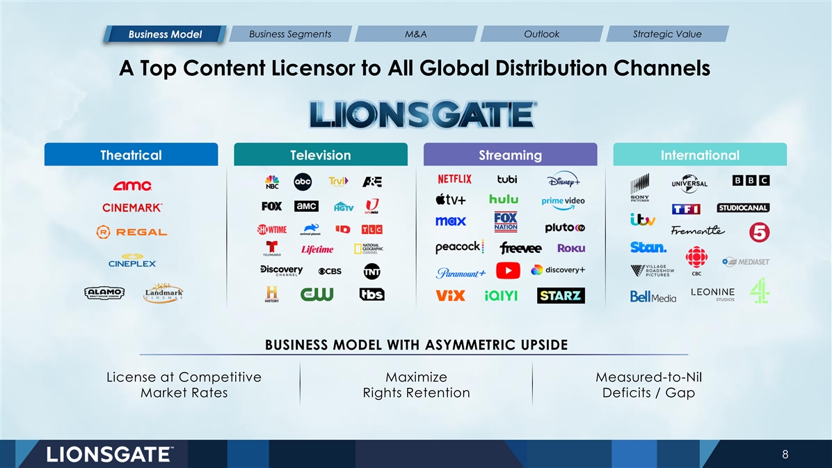 Business Segments M&A Outlook Strategic Value Business Model Lionsgate Studios’ Business Model Benefits from a Changing Industry Ecosystem Agile, Platform-Agnostic Studio Organized Legacy Studio Economics Impacted by Linear Across Motion Picture, Television and Networks and Investments in Vertically Talent Management Integrated Streaming Platforms Large IP Bases and Deep Portfolios of Content Large IP Bases and Deep Portfolios of Content Optionality to License at Competitive Rates Bound to Vertically Integrated Captive Platforms Focus on International Licensing De-Risks Downside Large Self-Distribution Infrastructure Increases Risk 7