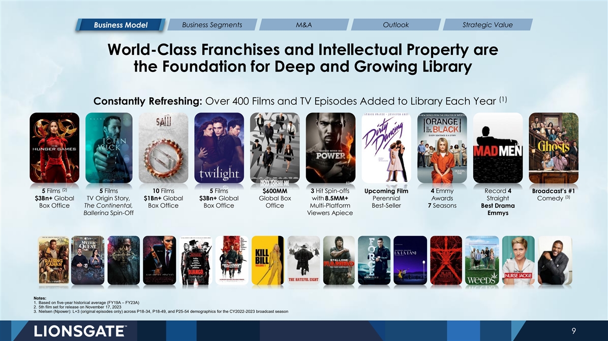Business Segments M&A Outlook Strategic Value Business Model A Top Content Licensor to All Global Distribution Channels Theatrical Television Streaming International BUSINESS MODEL WITH ASYMMETRIC UPSIDE License at Competitive Maximize Measured-to-Nil Market Rates Rights Retention Deficits / Gap 8