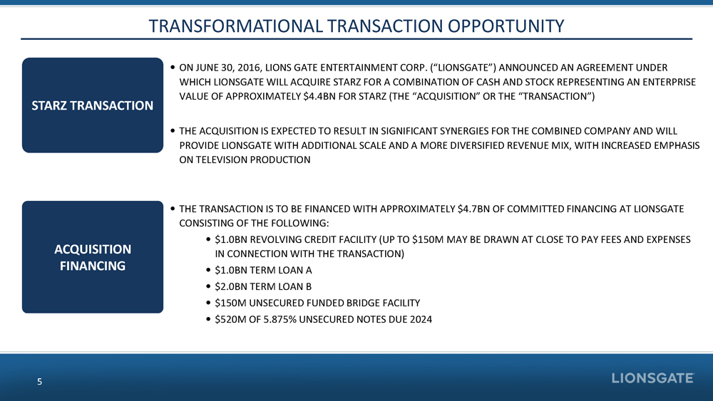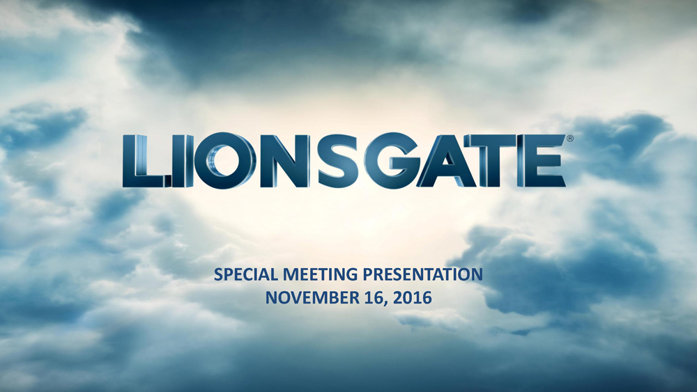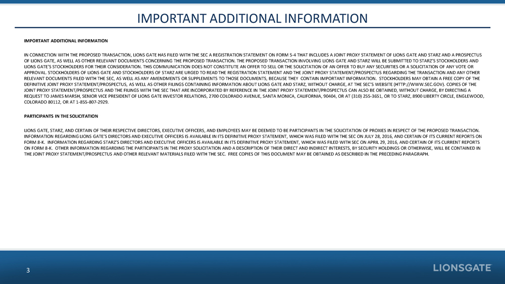 FORWARD - LOOKING STATEMENTS 2 CAUTION REGARDING FORWARD - LOOKING STATEMENTS THIS COMMUNICATION MAY CONTAIN CERTAIN FORWARD - LOOKING STATEMENTS, IN CLUDING CERTAIN PLANS, EXPECTATIONS, GOALS, PROJECTIONS, AND STA TEMENTS ABOUT THE BENEFITS OF THE PROPOSED TRANSACTION, THE MERGER PARTIES’ PLANS, OBJECTIVES, EXPECTATIONS AND INTENTIO NS, THE EXPECTED TIMING OF COMPLETION OF THE TRANSACTION, AND OT HER STATEMENTS THAT ARE NOT HISTORICAL FACTS. SUCH STATEMENTS AR E SUBJECT TO NUMEROUS ASSUMPTIONS, RISKS, AND UNCERTAINTIES. STATE MENTS THAT DO NOT DESCRIBE HISTORICAL OR CURRENT FACTS, INCLUDIN G STATEMENTS ABOUT BELIEFS AND EXPECTATIONS, ARE FORWARD - LOOKING STATEMENTS. FORWARD - LOOKING STATEMENTS MAY BE IDENTIFIED BY WORD S SUCH AS EXPECT, ANTICIPATE, BELIEVE, INTEND, ESTIMATE, PLAN, T ARGET, GOAL, OR SIMILAR EXPRESSIONS, OR FUTURE OR CONDITIONAL VE RBS SUCH AS WILL, MAY, MIGHT, SHOULD, WOULD, COULD, OR SIMILAR VARIA TIONS. WHILE THERE IS NO ASSURANCE THAT ANY LIST OF RISKS AND UNCERTAIN TIES OR RISK FACTORS IS COMPLETE, BELOW ARE CERTAIN FACTORS WHIC H COULD CAUSE ACTUAL RESULTS TO DIFFER MATERIALLY FROM THOSE CONTAINED OR IMPLIED IN THE FORWARD - LOOKING STATEMENTS INCLUDING : THE SUBSTANTIAL INVESTMENT OF CAPITAL REQUIRED TO PRODUCE AND MARKET FILMS AND TELEVISION SERIES; INCREASED COSTS FOR PRODUCING AND MARKETING FEATURE FILMS AND TELEVISION SERIES; BUD GET OVERRUNS, LIMITATIONS IMPOSED BY LIONS GATE’S OR STARZ’S CRE DIT FACILITIES AND NOTES; UNPREDICTABILITY OF THE COMMERCIAL SUC CESS OF LIONS GATE’S OR STARZ’S MOTION PICTURES AND TELEVISION PROGRA MMING; RISKS RELATED TO LIONS GATE’S OR STARZ’S ACQUISITION AND INTEGRATION OF ACQUIRED BUSINESSES; THE EFFECTS OF DISPOSITIONS OF BUSINESSES OR ASSETS, INCLUDING INDIVIDUAL FILMS OR LIBRARIES; T HE COST OF DEFENDING LIONS GATE’S OR STARZ’S INTELLECTUAL PROPER TY; TECHNOLOGICAL CHANGES AND OTHER TRENDS AFFECTING THE ENTERTAINMENT INDUSTRY; THE POSSIBILITY THAT THE PROPOSED TRANSA CTION DOES NOT CLOSE WHEN EXPECTED OR AT ALL BECAUSE REQUIRED RE GULATORY, SHAREHOLDER OR OTHER APPROVALS ARE NOT RECEIVED OR OTHER CONDITIONS TO THE CLOSING ARE NOT SATISFIED ON A TIMELY BA SIS OR AT ALL; THE RISK THAT THE FINANCING REQUIRED TO FUND THE TRANSACTION IS NOT OBTAINED; POTENTIAL ADVERSE REACTIONS OR CHAN GES TO BUSINESS OR EMPLOYEE RELATIONSHIPS, INCLUDING THOSE RESULTING FR OM THE ANNOUNCEMENT OR COMPLETION OF THE TRANSACTION; UNCERTAINT IES AS TO THE TIMING OF THE TRANSACTION; COMPETITIVE RESPONSES TO THE TRANSACTION; THE POSSIBILITY THAT THE ANTICIPATED BENEFIT S OF THE TRANSACTION ARE NOT REALIZED WHEN EXPECTED OR AT ALL, I NCLUDING AS A RESULT OF THE IMPACT OF, OR PROBLEMS ARISING FROM, THE INTEGRATION OF THE TWO COMPANIES; THE POSSIBILITY THAT THE TRANS ACTION MAY BE MORE EXPENSIVE TO COMPLETE THAN ANTICIPATED, INCLU DING AS A RESULT OF UNEXPECTED FACTORS OR EVENTS; DIVERSION OF MANAGEMENT’S ATTENTION FROM ONGOING BUSINESS OPERATIONS AND OPPO RTUNITIES; POTENTIAL ADVERSE REACTIONS OR CHANGES TO BUSINESS OR EMPLOYEE RELATIONSHIPS, INCLUDING THOSE RESULTING FROM THE ANNOUNCEMENT OR COMPLETION OF THE TRANSACTION; LIONS GATE’S ABIL ITY TO COMPLETE THE ACQUISITION AND INTEGRATION OF STARZ SUCCESS FULLY; LITIGATION RELATING TO THE TRANSACTION; AND OTHER FACTORS THAT MAY AFFECT FUTURE RESULTS OF LIONS GATE AND STARZ. ADDITION AL FACTORS THAT COULD CAUSE RESULTS TO DIFFER MATERIALLY FROM TH OSE DESCRIBED ABOVE CAN BE FOUND IN LIONS GATE’S ANNUAL REPORT O N FORM 10 - K FOR THE YEAR ENDED MARCH 31, 2016, AND IN ITS SUBSEQUE NT QUARTERLY REPORTS ON FORM 10 - Q, INCLUDING FOR THE QUARTERS EN DED JUNE 30, 2016 AND SEPTEMBER 30, 2016, EACH OF WHICH IS ON FI LE WITH THE SECURITIES AND EXCHANGE COMMISSION (THE “SEC”) AND AVAI LABLE IN THE “CORPORATE” SECTION OF LIONS GATE’S WEBSITE, HTTP:/ /WWW.LIONSGATE.COM, UNDER THE HEADING “REPORTS” AND IN OTHER DOCUMENTS LIONS GATE FILES WITH THE SEC, AND IN STARZ’S ANNUAL R EPORT ON FORM 10 - K FOR THE YEAR ENDED DECEMBER 31, 2015 AND IN I TS SUBSEQUENT QUARTERLY REPORTS ON FORM 10 - Q, INCLUDING FOR THE QUARTERS ENDED MARCH 31, 2016, JUNE 30, 2016 AND SEPTEMBER 30, 2 016, EACH OF WHICH IS ON FILE WITH THE SEC AND AVAILABLE IN THE “STARZ CORPORATE” SECTION OF STARZ’S WEBSITE, HTTP://WWW.STARZ.C OM, UNDER THE SUBSECTION “INVESTOR RELATIONS” AND THEN UNDER THE HEA DING “SEC FILINGS” AND IN OTHER DOCUMENTS STARZ FILES WITH THE S EC. ALL FORWARD - LOOKING STATEMENTS SPEAK ONLY AS OF THE DATE THEY AR E MADE AND ARE BASED ON INFORMATION AVAILABLE AT THAT TIME. NEIT HER LIONS GATE NOR STARZ ASSUMES ANY OBLIGATION TO UPDATE FORWARD - LOOKING STATEMENTS TO REFLECT CIRCUMSTANCES OR EVENTS TH AT OCCUR AFTER THE DATE THE FORWARD - LOOKING STATEMENTS WERE MADE OR TO REFLECT THE OCCURRENCE OF UNANTICIPATED EVENTS EXCEPT AS REQUIRED BY FEDERAL SECURITIES LAWS. AS FORWARD - LOOKIN G STATEMENTS INVOLVE SIGNIFICANT RISKS AND UNCERTAINTIES, CAUTIO N SHOULD BE EXERCISED AGAINST PLACING UNDUE RELIANCE ON SUCH STATEMENTS .