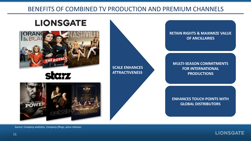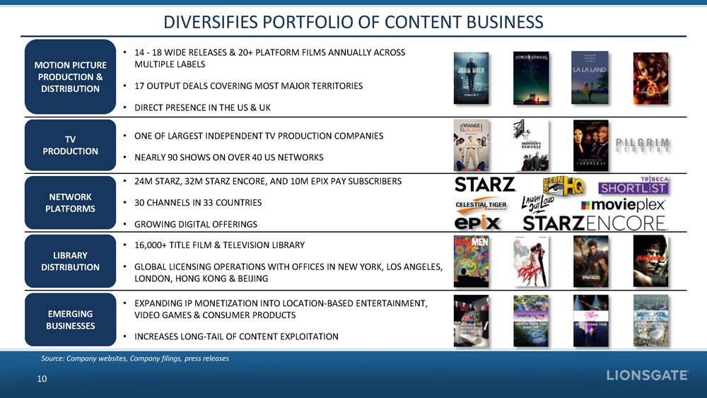 • 14 - 18 WIDE RELEASES & 20+ PLATFORM FILMS ANNUALLY ACROSS MULTIPLE LABELS • 17 OUTPUT DEALS COVERING MOST MAJOR TERRITORIES • DIRECT PRESENCE IN THE US & UK • ONE OF LARGEST INDEPENDENT TV PRODUCTION COMPANIES • NEARLY 90 SHOWS ON OVER 40 US NETWORKS • 16,000+ TITLE FILM & TELEVISION LIBRARY • GLOBAL LICENSING OPERATIONS WITH OFFICES IN NEW YORK, LOS ANGELE S, LONDON, HONG KONG & BEIJING • EXPANDING IP MONETIZATION INTO LOCATION - BASED ENTERTAINMENT, VIDEO GAMES & CONSUMER PRODUCTS • INCREASES LONG - TAIL OF CONTENT EXPLOITATION • 24M STARZ , 32M STARZ ENCORE, AND 10M EPIX PAY SUBSCRIBERS • 30 CHANNELS IN 33 COUNTRIES • GROWING DIGITAL OFFERINGS Source: Company websites, Company filings, press releases DIVERSIFIES PORTFOLIO OF CONTENT BUSINESS 10 MOTION PICTURE PRODUCTION & DISTRIBUTION TV PRODUCTION NETWORK PLATFORMS LIBRARY DISTRIBUTION EMERGING BUSINESSES