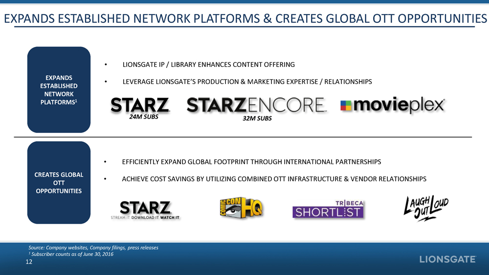 RETAIN RIGHTS & MAXIMIZE VALUE OF ANCILLARIES MULTI - SEASON COMMITMENTS FOR INTERNATIONAL PRODUCTIONS SCALE ENHANCES ATTRACTIVENESS ENHANCES TOUCH POINTS WITH GLOBAL DISTRIBUTORS BENEFITS OF COMBINED TV PRODUCTION AND PREMIUM CHANNELS 11 Source: Company websites, Company filings, press releases