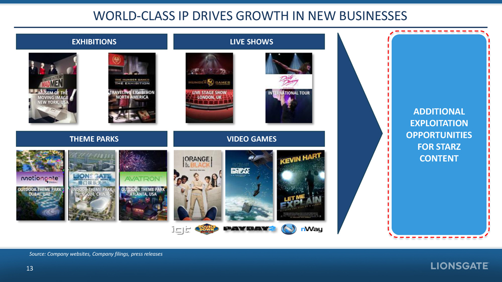 WORLD - CLASS IP DRIVES GROWTH IN NEW BUSINESSES 13 EXHIBITIONS LIVE SHOWS VIDEO GAMES THEME PARKS ADDITIONAL EXPLOITATION OPPORTUNITIES FOR STARZ CONTENT Source: Company websites, Company filings, press releases