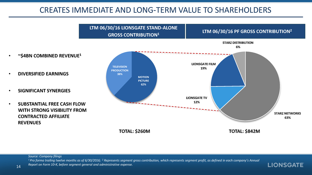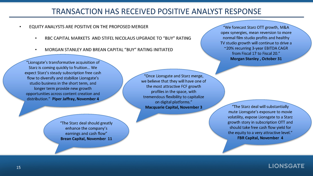 CREATES IMMEDIATE AND LONG - TERM VALUE TO SHAREHOLDERS LTM 06/30/16 PF GROSS CONTRIBUTION 2 14 Source: Company filings 1 P ro forma trailing twelve months as of 6/30/2016; 2 Represents segment gross contribution, which represents segment profit, as defined in each company’s Annual Report on Form 10 - K, before segment general and administrative expense. • ~$4BN COMBINED REVENUE 1 • DIVERSIFIED EARNINGS • SIGNIFICANT SYNERGIES • SUBSTANTIAL FREE CASH FLOW WITH STRONG VISIBILITY FROM CONTRACTED AFFILIATE REVENUES MOTION PICTURE 62% TELEVISION PRODUCTION 38% LTM 06/30/16 LIONSGATE STAND - ALONE GROSS CONTRIBUTION 1 TOTAL: $260M TOTAL: $842M STARZ NETWORKS 63% LIONSGATE TV 12% LIONSGATE FILM 19% STARZ DISTRIBUTION 6%