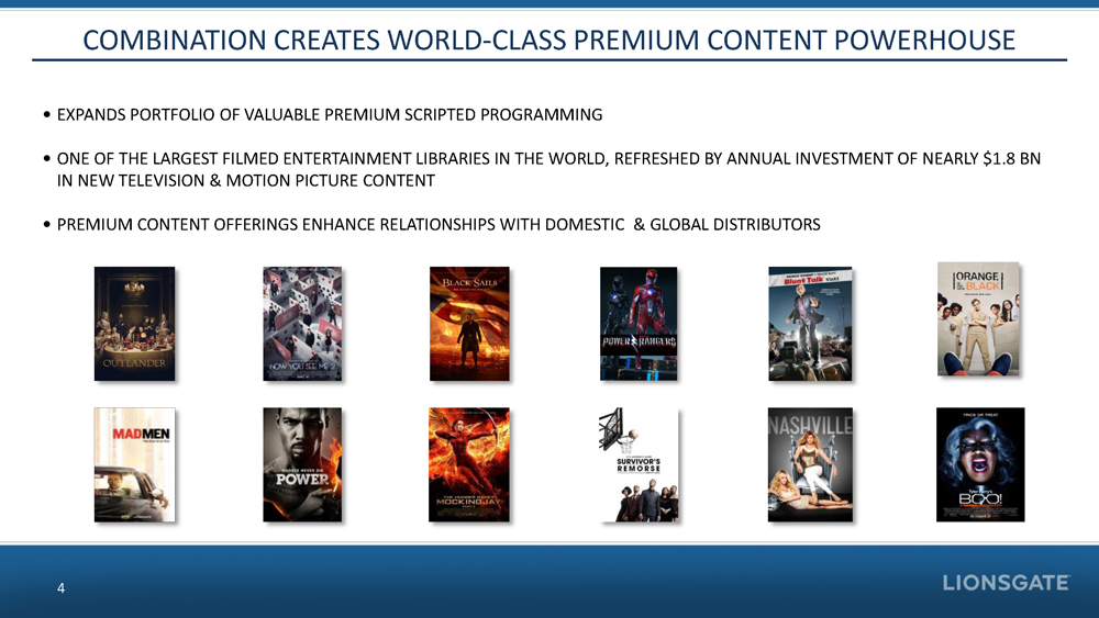 IMPORTANT ADDITIONAL INFORMATION 3 IMPORTANT ADDITIONAL INFORMATION IN CONNECTION WITH THE PROPOSED TRANSACTION, LIONS GATE HAS FILE D WITH THE SEC A REGISTRATION STATEMENT ON FORM S - 4 THAT INCLUDE S A JOINT PROXY STATEMENT OF LIONS GATE AND STARZ AND A PROSPECT US OF LIONS GATE, AS WELL AS OTHER RELEVANT DOCUMENTS CONCERNING TH E PROPOSED TRANSACTION. THE PROPOSED TRANSACTION INVOLVING LIONS GATE AND STARZ WILL BE SUBMITTED TO STARZ’S STOCKHOLDERS AND LIONS GATE’S STOCKHOLDERS FOR THEIR CONSIDERATION. THIS COMMUNIC ATION DOES NOT CONSTITUTE AN OFFER TO SELL OR THE SOLICITATION O F AN OFFER TO BUY ANY SECURITIES OR A SOLICITATION OF ANY VOTE O R APPROVAL. STOCKHOLDERS OF LIONS GATE AND STOCKHOLDERS OF STARZ A RE URGED TO READ THE REGISTRATION STATEMENT AND THE JOINT PROXY STATEMENT/PROSPECTUS REGARDING THE TRANSACTION AND ANY OTHER RELEVANT DOCUMENTS FILED WITH THE SEC, AS WELL AS ANY AMENDMENTS OR SUPPLEMENTS TO THOSE DOCUMENTS, BECAUSE THEY CONTAIN IMPORT ANT INFORMATION. STOCKHOLDERS MAY OBTAIN A FREE COPY OF THE DEFINITIVE JOINT PROXY STATEMENT/PROSPECTUS, AS WELL AS OTHER FI LINGS CONTAINING INFORMATION ABOUT LIONS GATE AND STARZ, WITHOUT CHARGE, AT THE SEC’S WEBSITE (HTTP://WWW.SEC.GOV). COPIES OF TH E JOINT PROXY STATEMENT/PROSPECTUS AND THE FILINGS WITH THE SEC TH AT ARE INCORPORATED BY REFERENCE IN THE JOINT PROXY STATEMENT/PR OSPECTUS CAN ALSO BE OBTAINED, WITHOUT CHARGE, BY DIRECTING A REQUEST TO JAMES MARSH, SENIOR VICE PRESIDENT OF LIONS GATE INVE STOR RELATIONS, 2700 COLORADO AVENUE, SANTA MONICA, CALIFORNIA, 90404, OR AT (310) 255 - 3651, OR TO STARZ, 8900 LIBERTY CIRCLE, E NGLEWOOD, COLORADO 80112, OR AT 1 - 855 - 807 - 2929. PARTICIPANTS IN THE SOLICITATION LIONS GATE, STARZ, AND CERTAIN OF THEIR RESPECTIVE DIRECTORS, EX ECUTIVE OFFICERS, AND EMPLOYEES MAY BE DEEMED TO BE PARTICIPANTS IN THE SOLICITATION OF PROXIES IN RESPECT OF THE PROPOSED TRANS ACTION. INFORMATION REGARDING LIONS GATE’S DIRECTORS AND EXECUTIVE OFFIC ERS IS AVAILABLE IN ITS DEFINITIVE PROXY STATEMENT, WHICH WAS FI LED WITH THE SEC ON JULY 28, 2016, AND CERTAIN OF ITS CURRENT RE PORTS ON FORM 8 - K. INFORMATION REGARDING STARZ’S DIRECTORS AND EXECUTIVE OFFICERS IS AVAILABLE IN ITS DEFINITIVE PROXY STATEMENT, WHICH WAS FILED WITH SEC ON APRIL 29, 2016, AND CERTAIN OF ITS CURRENT REPORTS ON FORM 8 - K. OTHER INFORMATION REGARDING THE PARTICIPANTS IN TH E PROXY SOLICITATION AND A DESCRIPTION OF THEIR DIRECT AND INDIR ECT INTERESTS, BY SECURITY HOLDINGS OR OTHERWISE, WILL BE CONTAI NED IN THE JOINT PROXY STATEMENT/PROSPECTUS AND OTHER RELEVANT MATERIAL S FILED WITH THE SEC. FREE COPIES OF THIS DOCUMENT MAY BE OBTAI NED AS DESCRIBED IN THE PRECEDING PARAGRAPH.