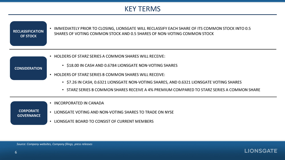 STARZ TRANSACTION ACQUISITION FINANCING TRANSFORMATIONAL TRANSACTION OPPORTUNITY • ON JUNE 30, 2016, LIONS GATE ENTERTAINMENT CORP . (“LIONSGATE”) ANNOUNCED AN AGREEMENT UNDER WHICH LIONSGATE WILL ACQUIRE STARZ FOR A COMBINATION OF CASH AND STOCK REPRESENTING AN ENTERPRISE VALUE OF APPROXIMATELY $4.4BN FOR STARZ (THE “ACQUISITION” OR THE “TRANSACTION ”) • THE ACQUISITION IS EXPECTED TO RESULT IN SIGNIFICANT SYNERGIES FOR THE COMBINED COMPANY AND WILL PROVIDE LIONSGATE WITH ADDITIONAL SCALE AND A MORE DIVERSIFIED REVENUE MIX, WITH INCREASED EMPHASIS ON TELEVISION PRODUCTION 5 • THE TRANSACTION IS TO BE FINANCED WITH APPROXIMATELY $4.7BN OF COMMITTED FINANCING AT LIONSGATE CONSISTING OF THE FOLLOWING : • $ 1.0BN REVOLVING CREDIT FACILITY (UP TO $150M MAY BE DRAWN AT CLOSE TO PAY FEES AND EXPENSES IN CONNECTION WITH THE TRANSACTION) • $ 1.0BN TERM LOAN A • $2.0BN TERM LOAN B • $ 150M UNSECURED FUNDED BRIDGE FACILITY • $520M OF 5.875% UNSECURED NOTES DUE 2024