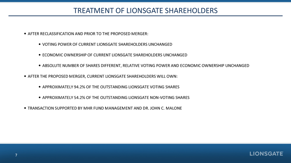 • IMMEDIATELY PRIOR TO CLOSING, LIONSGATE WILL RECLASSIFY EACH SHARE OF ITS COMMON STOCK INTO 0.5 SHARES OF VOTING COMMON STOCK AND 0.5 SHARES OF NON - VOTING COMMO N STOCK • HOLDERS OF STARZ SERIES A COMMON SHARES WILL RECEIVE: • $ 18.00 IN CASH AND 0.6784 LIONSGATE NON - VOTING SHARES • HOLDERS OF STARZ SERIES B COMMON SHARES WILL RECEIVE: • $ 7.26 IN CASH, 0.6321 LIONSGATE NON - VOTING SHARES, AND 0.6321 LIONSGATE VOTING SHARES • STARZ SERIES B COMMON SHARES RECEIVE A 4% PREMIUM COMPARED TO STARZ SE RIES A COMMON SHARE Source: Company websites, Company filings, press releases KEY TERMS 6 RECLASSIFICATION OF STOCK CONSIDERATION CORPORATE GOVERNANCE • INCORPORATED IN CANADA • LIONSGATE VOTING AND NON - VOTING SHARES TO TRADE ON NYSE • LIONSGATE BOARD TO CONSIST OF CURRENT MEMBERS