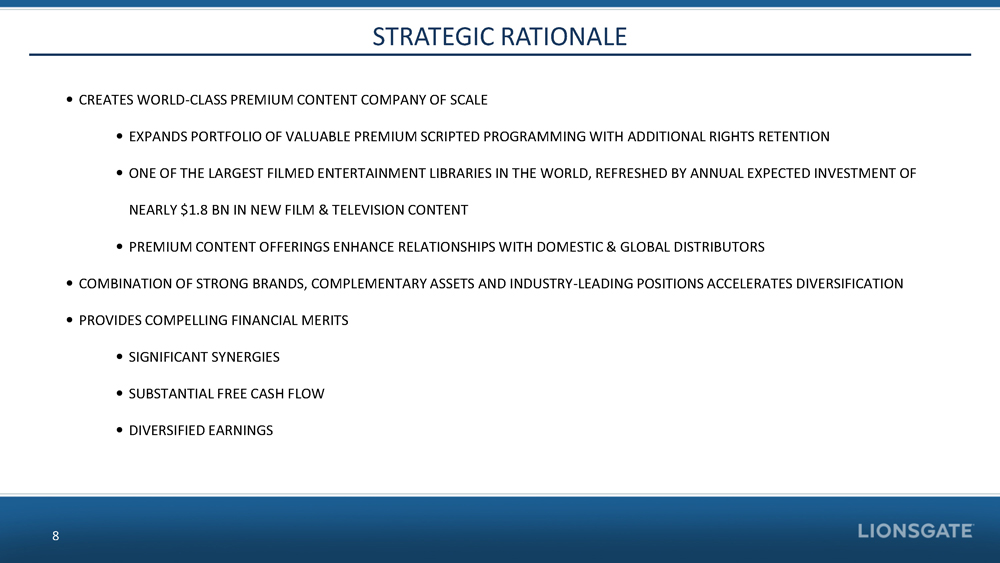 TREATMENT OF LIONSGATE SHAREHOLDERS 7 • AFTER RECLASSIFICATION AND PRIOR TO THE PROPOSED MERGER: • VOTING POWER OF CURRENT LIONSGATE SHAREHOLDERS UNCHANGED • ECONOMIC OWNERSHIP OF CURRENT LIONSGATE SHAREHOLDERS UNCHANGED • ABSOLUTE NUMBER OF SHARES DIFFERENT, RELATIVE VOTING POWER AND E CONOMIC OWNERSHIP UNCHANGED • AFTER THE PROPOSED MERGER, CURRENT LIONSGATE SHAREHOLDERS WILL O WN: • APPROXIMATELY 94.2% OF THE OUTSTANDING LIONSGATE VOTING SHARES • APPROXIMATELY 54.2% OF THE OUTSTANDING LIONSGATE NON - VOTING SHAR ES • TRANSACTION SUPPORTED BY MHR FUND MANAGEMENT AND DR. JOHN C. MALONE