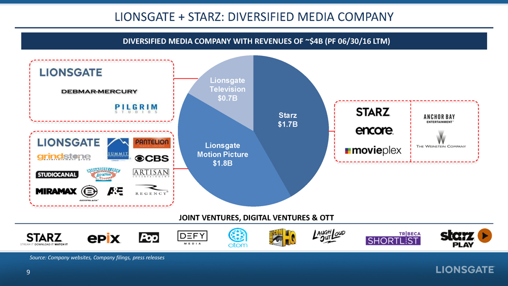 • CREATES WORLD - CLASS PREMIUM CONTENT COMPANY OF SCALE • EXPANDS PORTFOLIO OF VALUABLE PREMIUM SCRIPTED PROGRAMMING WITH ADDITIONAL RIGHTS RETENTION • ONE OF THE LARGEST FILMED ENTERTAINMENT LIBRARIES IN THE WORLD, REFR ESHED BY ANNUAL EXPECTED INVESTMENT OF NEARLY $1.8 BN IN NEW FILM & TELEVISION CONTENT • PREMIUM CONTENT OFFERINGS ENHANCE RELATIONSHIPS WITH DOMESTIC & GLOBAL D ISTRIBUTORS • COMBINATION OF STRONG BRANDS, COMPLEMENTARY ASSETS AND INDUSTRY - LEADING POSITIONS ACCELERATES DIVERSIFICATION • PROVIDES COMPELLING FINANCIAL MERITS • SIGNIFICANT SYNERGIES • SUBSTANTIAL FREE CASH FLOW • DIVERSIFIED EARNINGS STRATEGIC RATIONALE 8