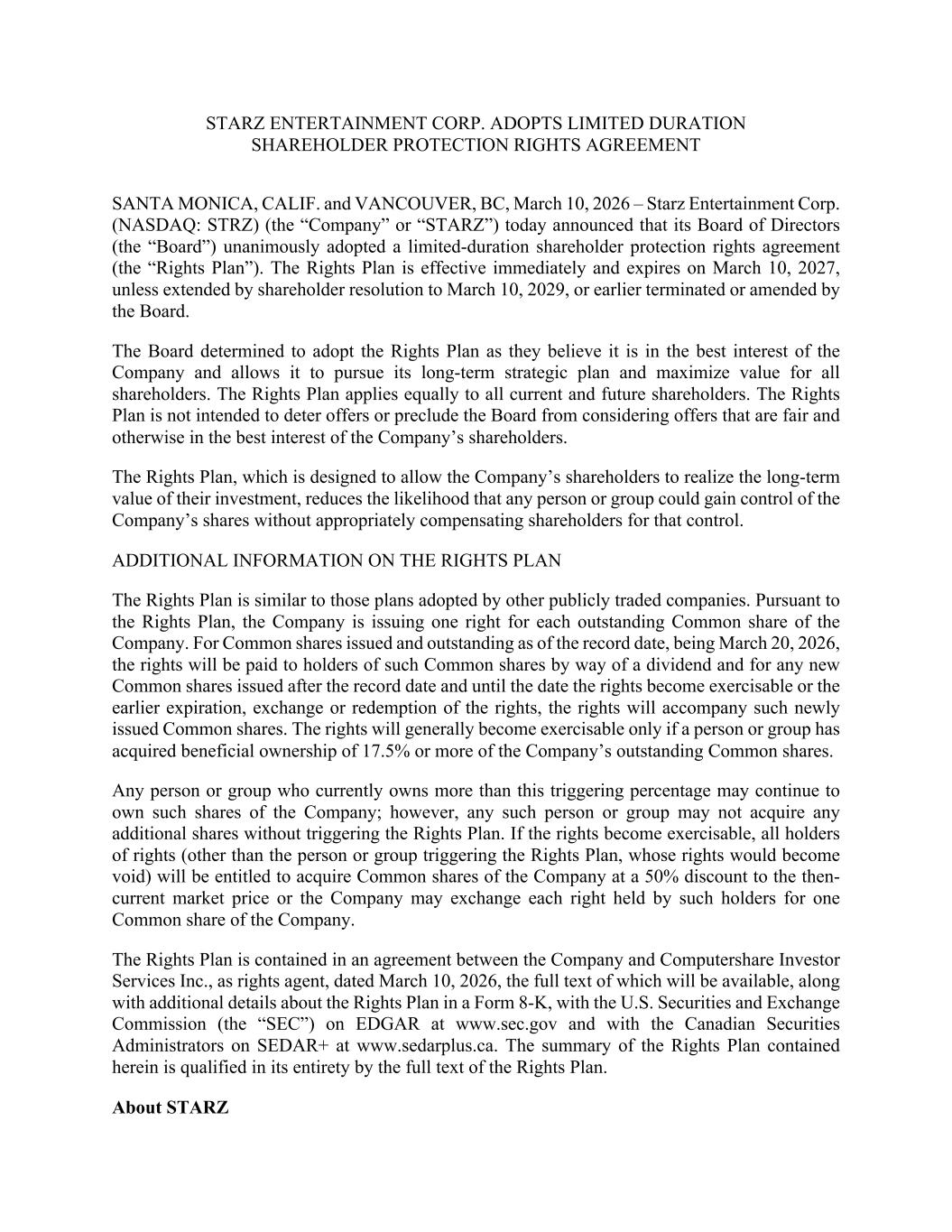 STARZ ENTERTAINMENT CORP. ADOPTS LIMITED DURATION SHAREHOLDER PROTECTION RIGHTS AGREEMENT SANTA MONICA, CALIF. and VANCOUVER, BC, March 10, 2026 – Starz Entertainment Corp. (NASDAQ: STRZ) (the “Company” or “STARZ”) today announced that its Board of Directors (the “Board”) unanimously adopted a limited-duration shareholder protection rights agreement (the “Rights Plan”). The Rights Plan is effective immediately and expires on March 10, 2027, unless extended by shareholder resolution to March 10, 2029, or earlier terminated or amended by the Board. The Board determined to adopt the Rights Plan as they believe it is in the best interest of the Company and allows it to pursue its long-term strategic plan and maximize value for all shareholders. The Rights Plan applies equally to all current and future shareholders. The Rights Plan is not intended to deter offers or preclude the Board from considering offers that are fair and otherwise in the best interest of the Company’s shareholders. The Rights Plan, which is designed to allow the Company’s shareholders to realize the long-term value of their investment, reduces the likelihood that any person or group could gain control of the Company’s shares without appropriately compensating shareholders for that control. ADDITIONAL INFORMATION ON THE RIGHTS PLAN The Rights Plan is similar to those plans adopted by other publicly traded companies. Pursuant to the Rights Plan, the Company is issuing one right for each outstanding Common share of the Company. For Common shares issued and outstanding as of the record date, being March 20, 2026, the rights will be paid to holders of such Common shares by way of a dividend and for any new Common shares issued after the record date and until the date the rights become exercisable or the earlier expiration, exchange or redemption of the rights, the rights will accompany such newly issued Common shares. The rights will generally become exercisable only if a person or group has acquired beneficial ownership of 17.5% or more of the Company’s outstanding Common shares. Any person or group who currently owns more than this triggering percentage may continue to own such shares of the Company; however, any such person or group may not acquire any additional shares without triggering the Rights Plan. If the rights become exercisable, all holders of rights (other than the person or group triggering the Rights Plan, whose rights would become void) will be entitled to acquire Common shares of the Company at a 50% discount to the then- current market price or the Company may exchange each right held by such holders for one Common share of the Company. The Rights Plan is contained in an agreement between the Company and Computershare Investor Services Inc., as rights agent, dated March 10, 2026, the full text of which will be available, along with additional details about the Rights Plan in a Form 8-K, with the U.S. Securities and Exchange Commission (the “SEC”) on EDGAR at www.sec.gov and with the Canadian Securities Administrators on SEDAR+ at www.sedarplus.ca. The summary of the Rights Plan contained herein is qualified in its entirety by the full text of the Rights Plan. About STARZ