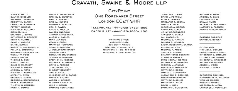 /s/ Cravath, Swaine & Moore LLP