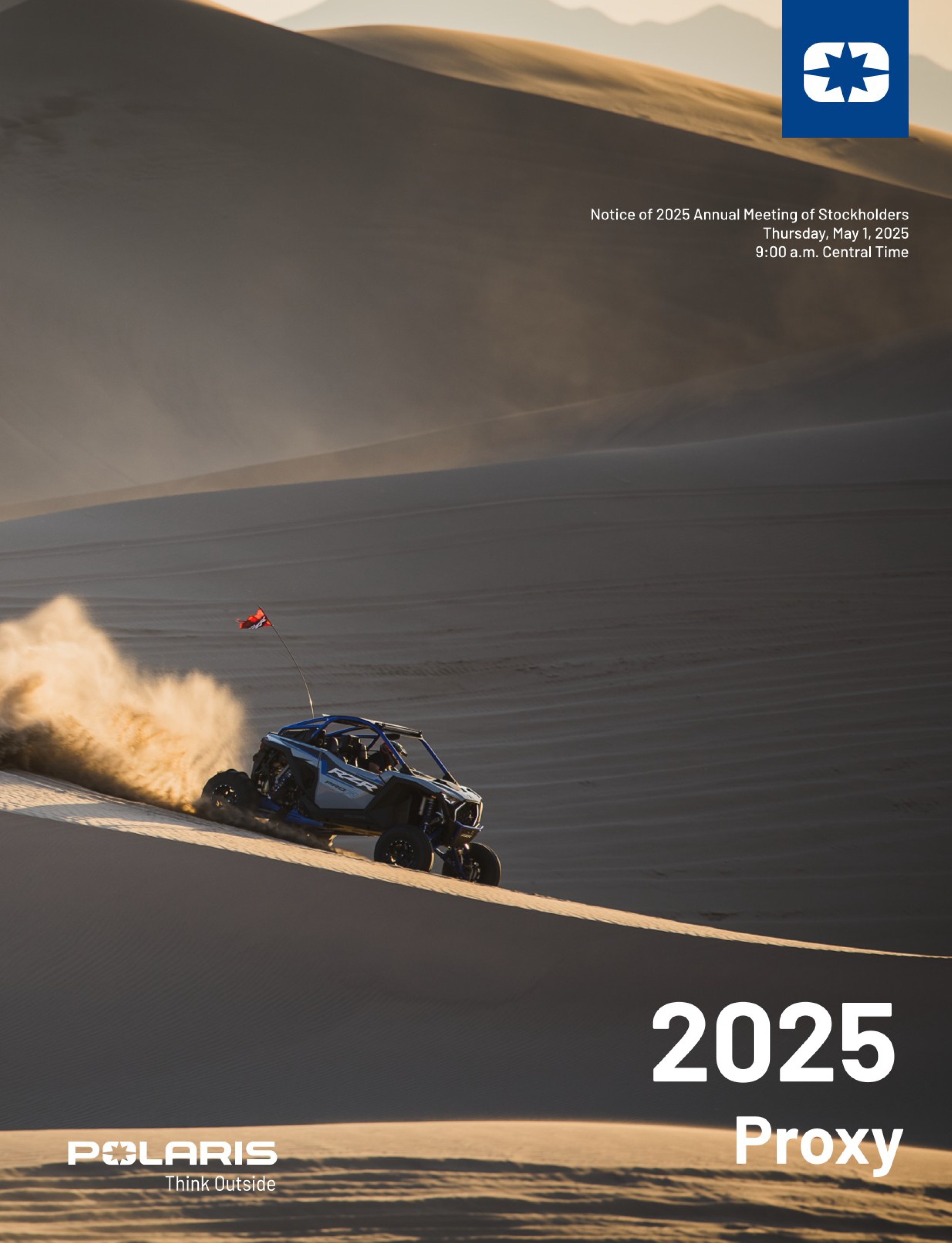Polaris Inc. will hold its 2025 Annual Meeting of Stockholders on Thursday, May 1, 2025, at 9:00 a.m. Central Time in a virtual format. You may attend the meeting, submit questions, and vote your shares electronically during the meeting by visiting www.virtualshareholdermeeting.com/PII2025. You will need the 16-digit control number that is printed on your Notice of Internet Availability of Proxy Materials or proxy card to enter the Annual Meeting site. We recommend that you log in at least 15 minutes before the meeting begins. The proxy materials were either made available to you over the Internet or mailed to you beginning on or about March 19, 2025. At the meeting, our stockholders will be asked to: