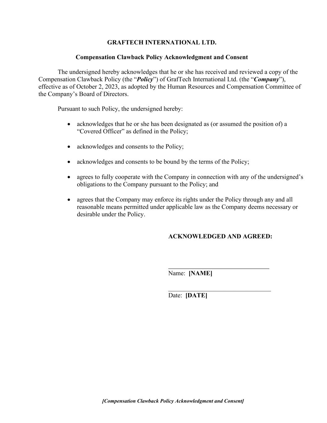 [Compensation Clawback Policy Acknowledgment and Consent] GRAFTECH INTERNATIONAL LTD. Compensation Clawback Policy Acknowledgment and Consent The undersigned hereby acknowledges that he or she has received and reviewed a copy of the Compensation Clawback Policy (the “Policy”) of GrafTech International Ltd. (the “Company”), effective as of October 2, 2023, as adopted by the Human Resources and Compensation Committee of the Company’s Board of Directors. Pursuant to such Policy, the undersigned hereby: • acknowledges that he or she has been designated as (or assumed the position of) a “Covered Officer” as defined in the Policy; • acknowledges and consents to the Policy; • acknowledges and consents to be bound by the terms of the Policy; • agrees to fully cooperate with the Company in connection with any of the undersigned’s obligations to the Company pursuant to the Policy; and • agrees that the Company may enforce its rights under the Policy through any and all reasonable means permitted under applicable law as the Company deems necessary or desirable under the Policy. ACKNOWLEDGED AND AGREED: Name: [NAME] ________________________________ Date: [DATE]