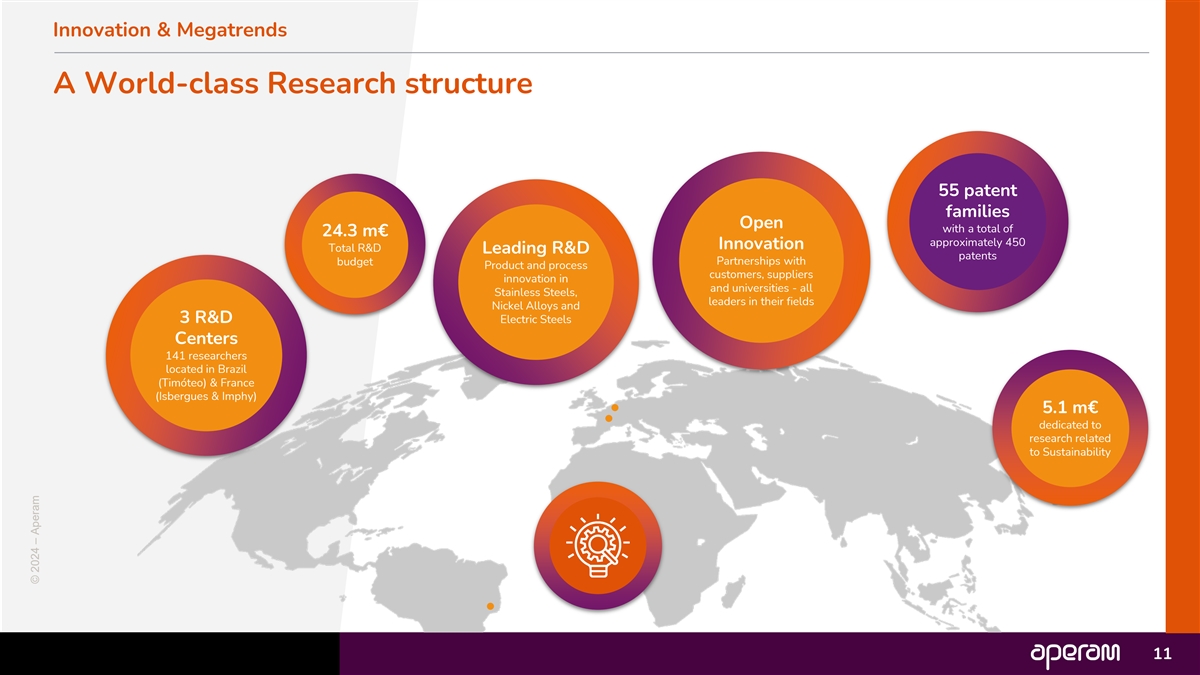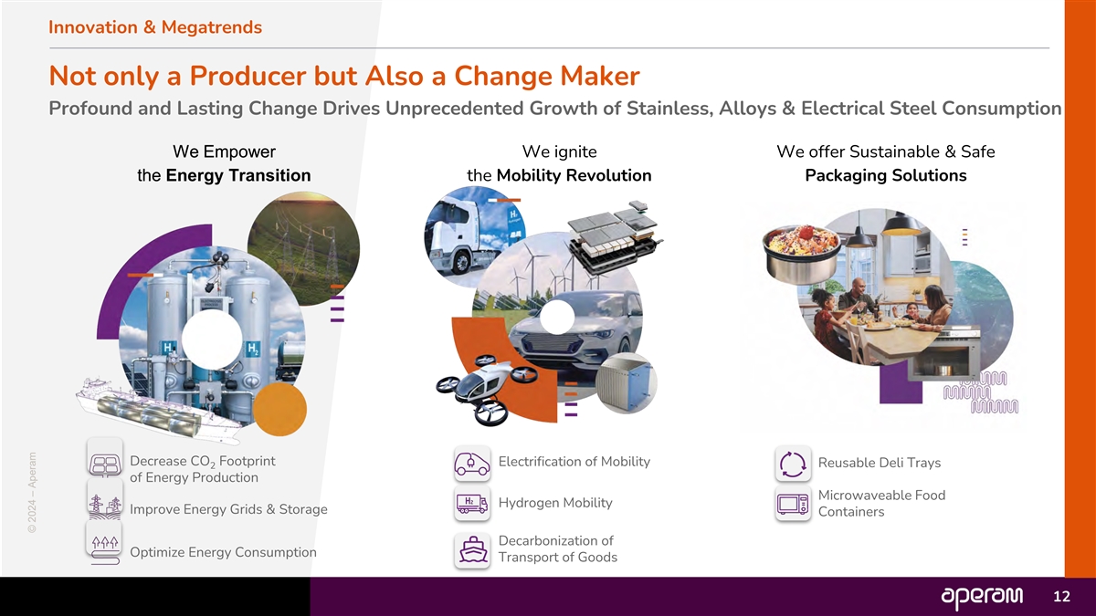 Innovation & Megatrends A World-class Research structure 55 patent families Open with a total of 24.3 m€ approximately 450 Innovation Total R&D Leading R&D patents budget Partnerships with Product and process customers, suppliers innovation in and universities - all Stainless Steels, leaders in their fields Nickel Alloys and 3 R&D Electric Steels Centers 141 researchers located in Brazil (Timóteo) & France (Isbergues & Imphy) 5.1 m€ dedicated to research related to Sustainability 11 © 2024 – Aperam