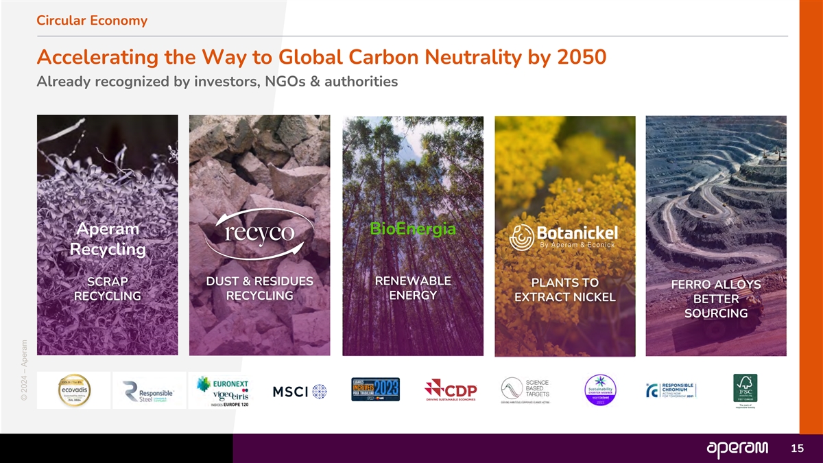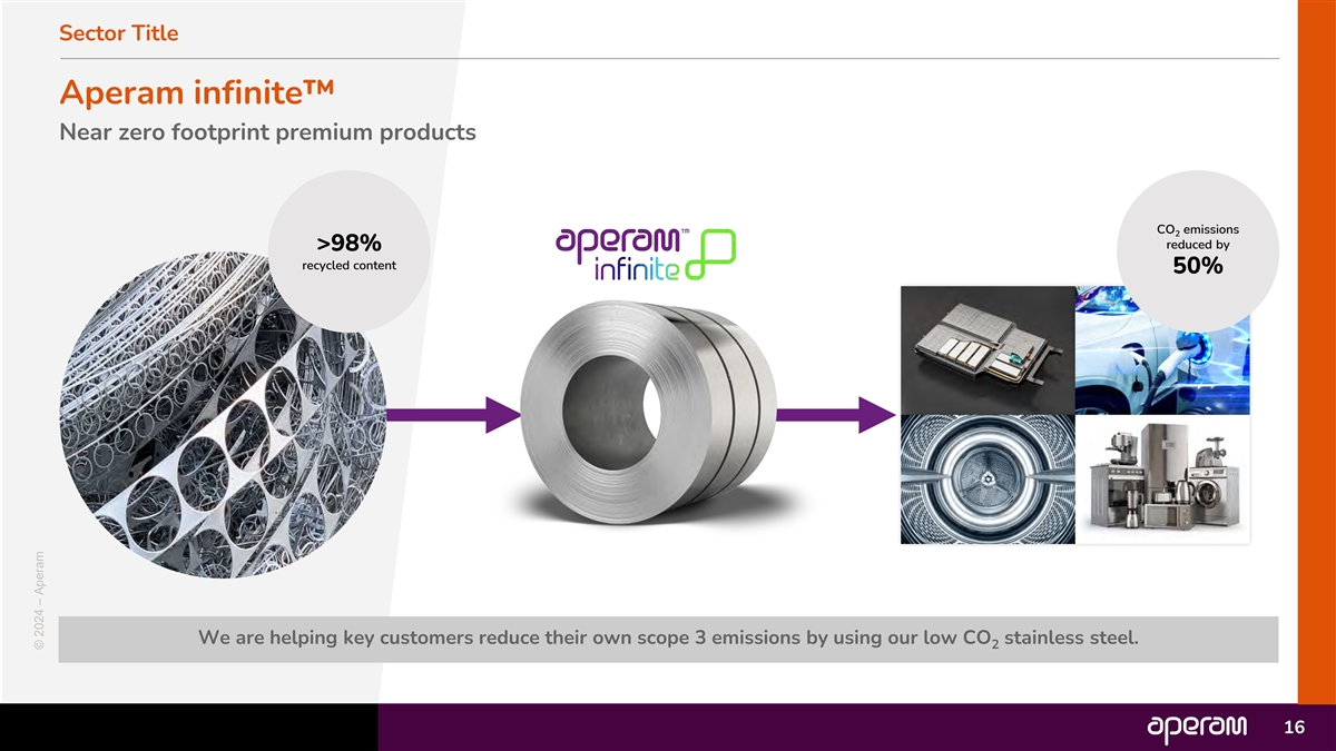 Sector Title Aperam infinite Near zero footprint premium products CO emissions 2 reduced by >98% recycled content 50% We are helping key customers reduce their own scope 3 emissions by using our low CO stainless steel. 2 16 © 2024 – Aperam