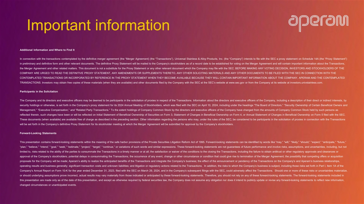 Important information Additional Information and Where to Find It In connection with the transactions contemplated by the definitive merger agreement (the “Merger Agreement) (the “Transactions”), Universal Stainless & Alloy Products, Inc. (the “Company”) intends to file with the SEC a proxy statement on Schedule 14A (the “Proxy Statement”) in preliminary and definitive form and other relevant documents. The definitive Proxy Statement will be mailed to the Company’s stockholders as of a record date to be established for voting on the Merger Agreement and will contain important information about the Transactions, the Merger Agreement and other related matters. This document is not a substitute for the Proxy Statement or any other relevant document which the Company may file with the SEC. BEFORE MAKING ANY VOTING DECISION, INVESTORS AND STOCKHOLDERS OF THE COMPANY ARE URGED TO READ THE DEFINITIVE PROXY STATEMENT, ANY AMENDMENTS OR SUPPLEMENTS THERETO, ANY OTHER SOLICITING MATERIALS AND ANY OTHER DOCUMENTS TO BE FILED WITH THE SEC IN CONNECTION WITH THE CONTEMPLATED TRANSACTIONS OR INCORPORATED BY REFERENCE IN THE PROXY STATEMENT WHEN THEY BECOME AVAILABLE BECAUSE THEY WILL CONTAIN IMPORTANT INFORMATION ABOUT THE COMPANY, APERAM AND THE CONTEMPLATED TRANSACTIONS. Investors may obtain free copies of these materials (when they are available) and other documents filed by the Company with the SEC at the SEC’s website at www.sec.gov or from the Company at its website at investors.univstainless.com. Participants in the Solicitation The Company and its directors and executive officers may be deemed to be participants in the solicitation of proxies in respect of the Transactions. Information about the directors and executive officers of the Company, including a description of their direct or indirect interests, by security holdings or otherwise, is set forth in the Company’s proxy statement for its 2024 Annual Meeting of Stockholders, which was filed with the SEC on April 10, 2024, including under the headings “The Board of Directors,” “Security Ownership of Certain Beneficial Owners and Management,” “Executive Compensation,” and “Related Party Transactions.” To the extent holdings of Company Common Stock by the directors and executive officers of the Company have changed from the amounts of Company Common Stock held by such persons as reflected therein, such changes have been or will be reflected on Initial Statement of Beneficial Ownership of Securities on Form 3, Statement of Changes in Beneficial Ownership on Form 4, or Annual Statement of Changes in Beneficial Ownership on Form 5 filed with the SEC. These documents (when available) are available free of charge as described in the preceding section. Other information regarding the persons who may, under the rules of the SEC, be considered to be participants in the solicitation of proxies in connection with the Transactions will be set forth in the Company’s definitive Proxy Statement for its stockholder meeting at which the Merger Agreement will be submitted for approval by the Company’s stockholders. Forward-Looking Statements This presentation contains forward-looking statements within the meaning of the safe harbor provisions of the Private Securities Litigation Reform Act of 1995. Forward-looking statements can be identified by words like “may,” “will,” “likely,” “should,” “expect,” “anticipate,” “future,” “plan,” “believe,” “intend,” “goal,” “seek,” “estimate,” “project,” “target,” “continue,” or variations of such words and similar expressions. These forward-looking statements are not guarantees of future performance and involve risks, assumptions, and uncertainties, including, but not limited to, risks related to the ability of the parties to consummate the Transactions in a timely manner or at all; the satisfaction or waiver of the conditions to the closing the Transactions, including the failure to obtain antitrust or other regulatory approvals and clearances or approval of the Company’s stockholders; potential delays in consummating the Transactions; the occurrence of any event, change or other circumstance or condition that could give rise to termination of the Merger Agreement; the possibility that competing offers or acquisition proposals for the Company will be made; Aperam’s ability to realize the anticipated benefits of the Transactions and integrate the Company’s business; the effect of the announcement or pendency of the Transactions on the Company’s and Aperam’s business relationships, operating results and business generally; significant transaction costs and unknown liabilities; and litigation or regulatory actions related to the Transactions. In addition, the risks to which the Company’s business is subject, including those risks set forth in Part I, Item 1A of the Company’s Annual Report on Form 10-K for the year ended December 31, 2023, filed with the SEC on March 29, 2024, and in the Company’s subsequent filings with the SEC, could adversely affect the Transactions. Should one or more of these risks or uncertainties materialize, or should underlying assumptions prove incorrect, actual results may vary materially from those indicated or anticipated by these forward-looking statements. Therefore, you should not rely on any of these forward-looking statements. The forward-looking statements included in this presentation are made only as of the date of this presentation, and except as otherwise required by federal securities law, the Company does not assume any obligation nor does it intend to publicly update or revise any forward-looking statements to reflect new information, changed circumstances or unanticipated events.