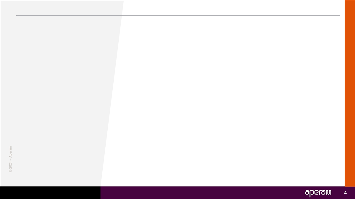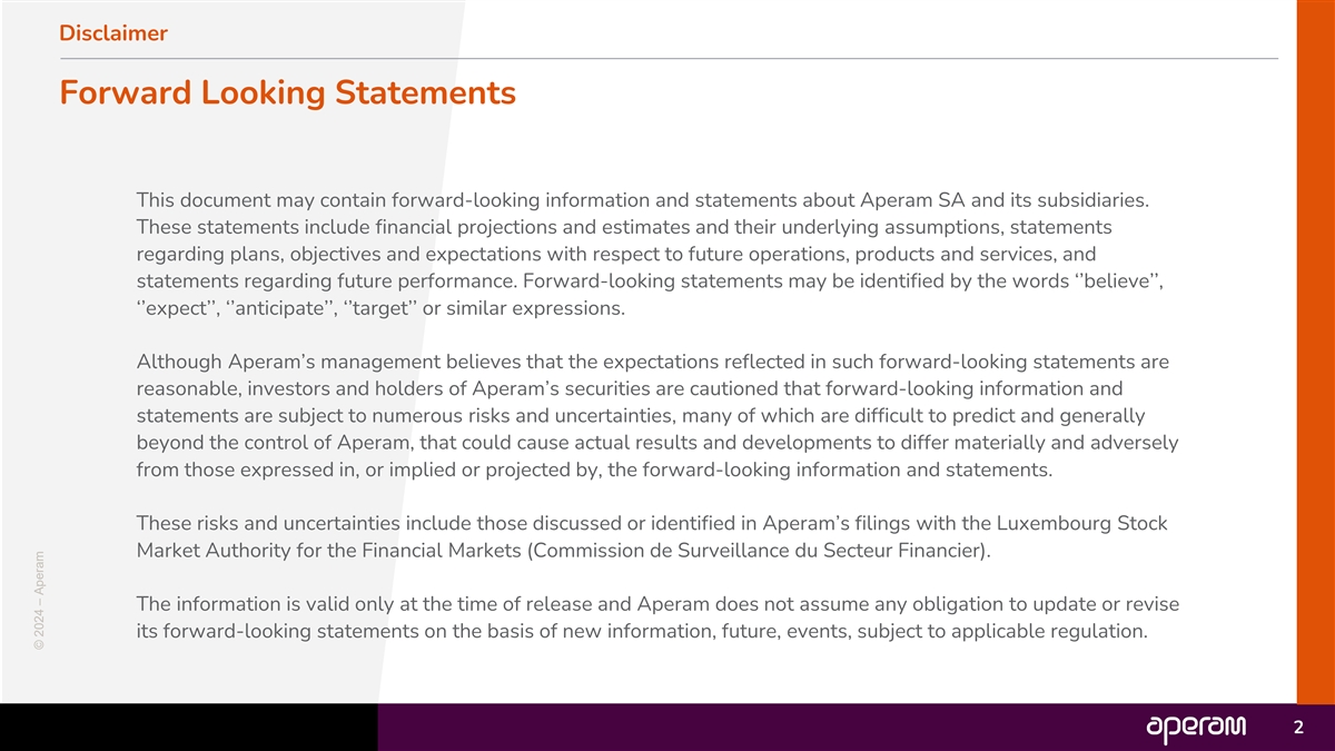 Disclaimer Forward Looking Statements This document may contain forward-looking information and statements about Aperam SA and its subsidiaries. These statements include financial projections and estimates and their underlying assumptions, statements regarding plans, objectives and expectations with respect to future operations, products and services, and statements regarding future performance. Forward-looking statements may be identified by the words ‘’believe’’, ‘’expect’’, ‘’anticipate’’, ‘’target’’ or similar expressions. Although Aperam’s management believes that the expectations reflected in such forward-looking statements are reasonable, investors and holders of Aperam’s securities are cautioned that forward-looking information and statements are subject to numerous risks and uncertainties, many of which are difficult to predict and generally beyond the control of Aperam, that could cause actual results and developments to differ materially and adversely from those expressed in, or implied or projected by, the forward-looking information and statements. These risks and uncertainties include those discussed or identified in Aperam’s filings with the Luxembourg Stock Market Authority for the Financial Markets (Commission de Surveillance du Secteur Financier). The information is valid only at the time of release and Aperam does not assume any obligation to update or revise its forward-looking statements on the basis of new information, future, events, subject to applicable regulation. 2 © 2024 – Aperam