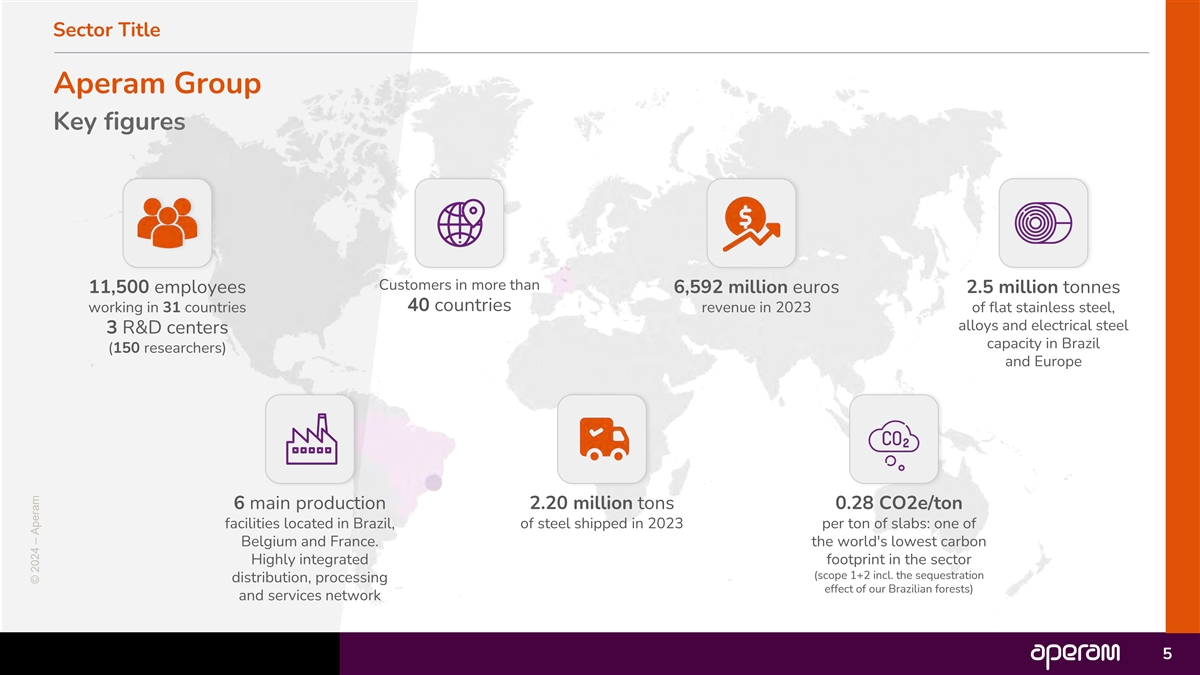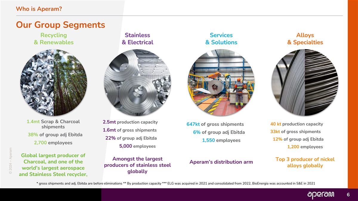 Sector Title Aperam Group Key figures Customers in more than 11,500 employees 6,592 million euros 2.5 million tonnes 40 countries working in 31 countries revenue in 2023 of flat stainless steel, alloys and electrical steel 3 R&D centers capacity in Brazil (150 researchers) and Europe 6 main production 2.20 million tons 0.28 CO2e/ton facilities located in Brazil, of steel shipped in 2023 per ton of slabs: one of Belgium and France. the world's lowest carbon Highly integrated footprint in the sector (scope 1+2 incl. the sequestration distribution, processing effect of our Brazilian forests) and services network 5 © 2024 – Aperam