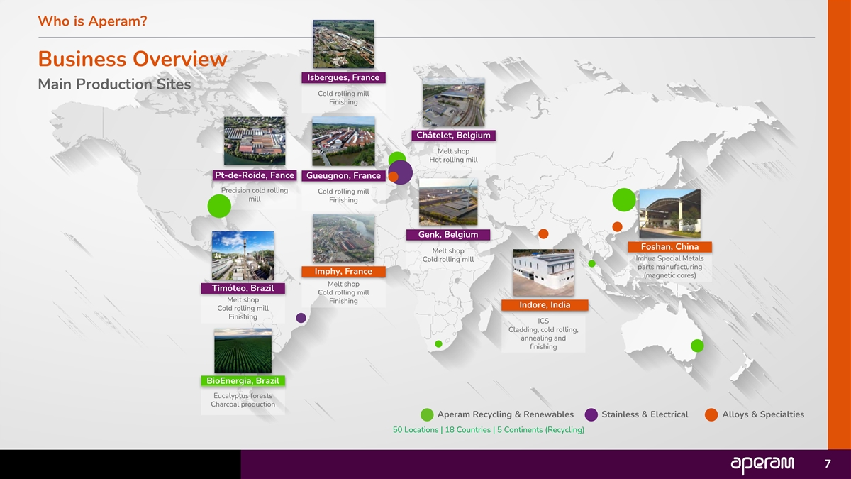 Who is Aperam? Our Group Segments Recycling Stainless Services Alloys & Renewables & Electrical & Solutions & Specialties 1.4mt Scrap & Charcoal 2.5mt production capacity 40 kt production capacity 647kt of gross shipments shipments 1.6mt of gross shipments 33kt of gross shipments 6% of group adj Ebitda 38% of group adj Ebitda 22% of group adj Ebitda 12% of group adj Ebitda 1,550 employees 2,700 employees 5,000 employees 1,200 employees Global largest producer of Amongst the largest Top 3 producer of nickel Charcoal, and one of the Aperam’s distribution arm producers of stainless steel alloys globally world’s largest aerospace globally and Stainless Steel recycler, * gross shipments and adj. Ebitda are before eliminations ** By production capacity *** ELG was acquired in 2021 and consolidated from 2022, BioEnergia was accounted in S&E in 2021 6 © 2024 – Aperam