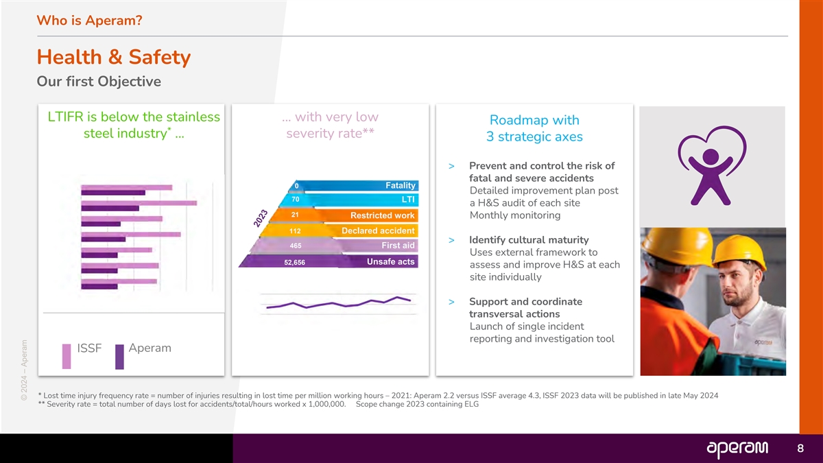 Who is Aperam? Health & Safety Our first Objective LTIFR is below the stainless … with very low Roadmap with * steel industry … severity rate** 3 strategic axes > Prevent and control the risk of fatal and severe accidents 0 Fatality Detailed improvement plan post 70 LTI a H&S audit of each site 21 Restricted work Monthly monitoring 112 Declared accident > Identify cultural maturity 465 First aid Uses external framework to 52,656 Unsafe acts assess and improve H&S at each site individually > Support and coordinate transversal actions Launch of single incident reporting and investigation tool Aperam ISSF * Lost time injury frequency rate = number of injuries resulting in lost time per million working hours – 2021: Aperam 2.2 versus ISSF average 4.3, ISSF 2023 data will be published in late May 2024 ** Severity rate = total number of days lost for accidents/total/hours worked x 1,000,000. Scope change 2023 containing ELG 8 © 2024 – Aperam